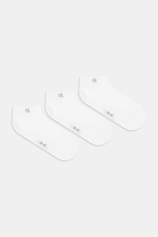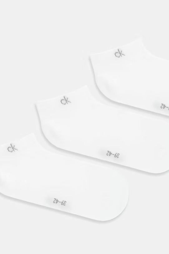 Ανδρικές Κάλτσες κοντές Calvin Klein. Συσκευασία 3ζεύγη Λευκές με logo CK. Κατασκευασμένες από υψηλής ποιότητας βαμβακερό ύφασμα, πολύ μαλακό και ελαστικό που προφέρει άψογη εφαρμογή και ενισχυμένη φτέρνα και δάχτυλα για μεγαλύτερη αντοχή.