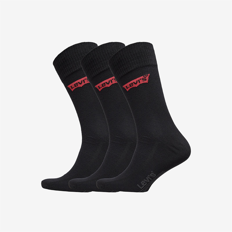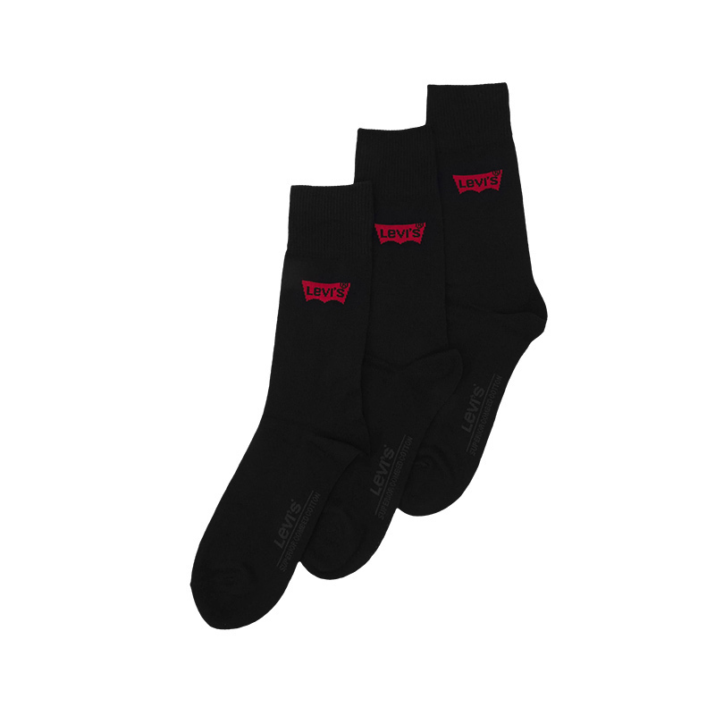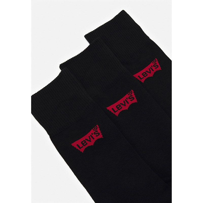 Ανδρικές κάλτσες Levi's μαύρες με logo σετ 3 τεμαχίων. Κάλτσες αθλιτικές από βαμβακερό ύφασμα με απαλή αίσθηση και ειδική πλέξη για να “ανασαίνει” το πόδι, ανθεκτικές με ενίσχυση σε δάκτυλα και φτέρνα, είναι ιδανικές για καθημερινή χρήση.