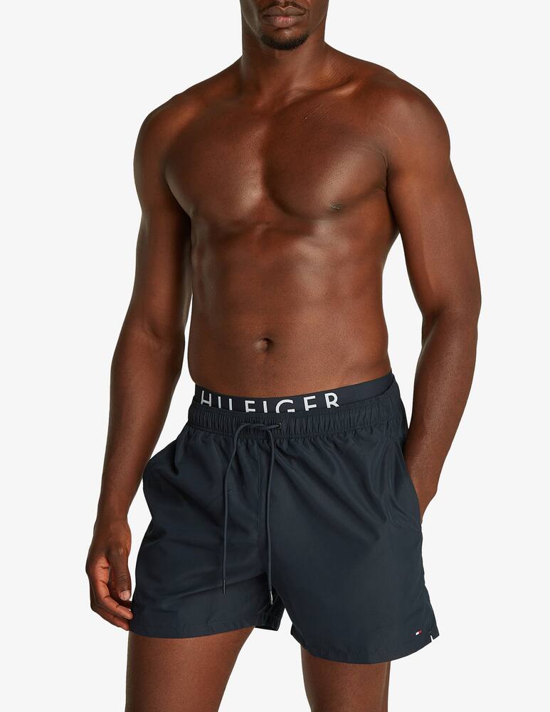 Ανδρικό μαγιό Tommy Hilfiger με κορδόνι στην μέση που προσφέρει σταθερότητα και τσέπες στο πλάι και πίσω. Μπλέ μαγιό βερμούδα  με τα Logo Tommy Hilfiger στο πλάι και στο λάστιχο . Κατασκευασμένο από  ανακυκλωμένο νάιλον ύφασμα κολύμβησης, στεγνώνει αμέσως και επιτρέπει άνεση κινήσεων.