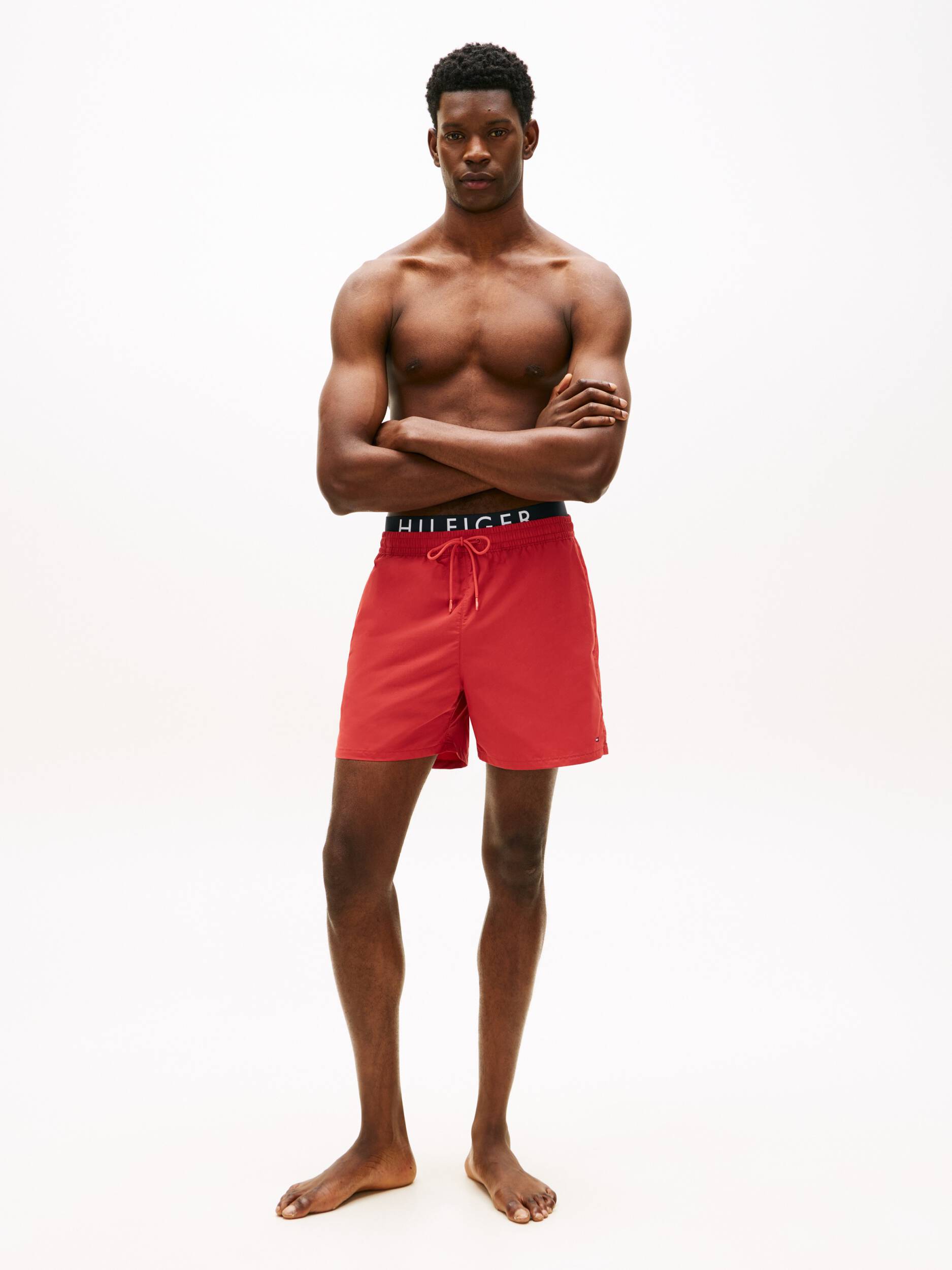 Ανδρικό μαγιό Tommy Hilfiger με κορδόνι στην μέση που προσφέρει σταθερότητα και τσέπες στο πλάι και πίσω. Πορτοκαλί μαγιό βερμούδα  με τα Logo Tommy Hilfiger στο πλάι και στο λάστιχο . Κατασκευασμένο από  ανακυκλωμένο νάιλον ύφασμα κολύμβησης, στεγνώνει αμέσως και επιτρέπει άνεση κινήσεων.