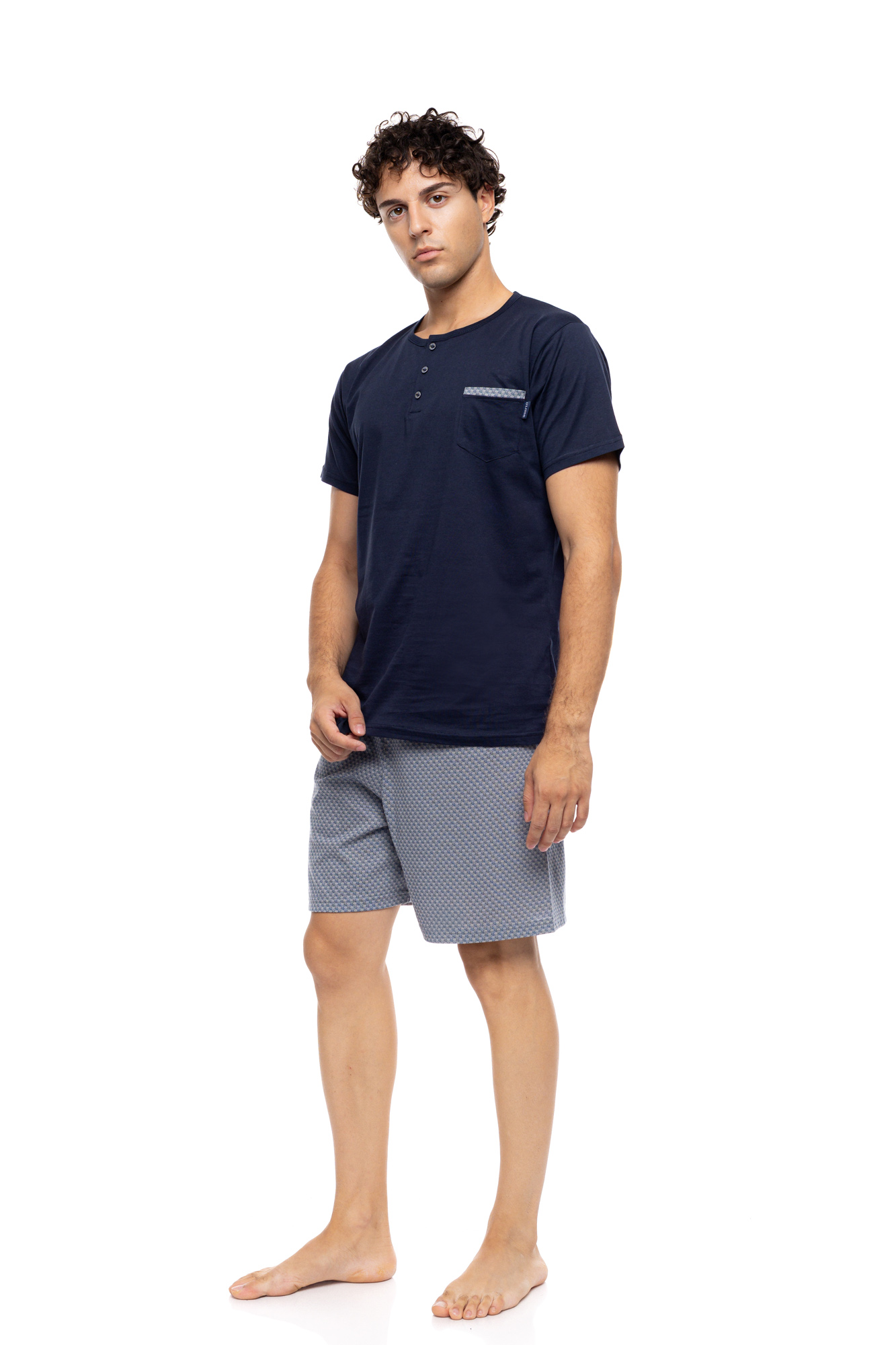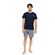 Ανδρική Καλοκαιρινή Πυζάμα Ulisse  3 τεαχίων με γκρί εμπριμέ βερμούδα και  μπλέ μακρύ παντελόνι ,μπλε σκούρη μπλούζα με κοντό μανίκι και στρογγυλή λαιμόκοψη. Διαθέτει πατιλέτα .  Δροσερή και απορροφητική πυτζάμα κατασκευασμένη από από υψηλής ποιότητας βαμβακερό ύφασμα.