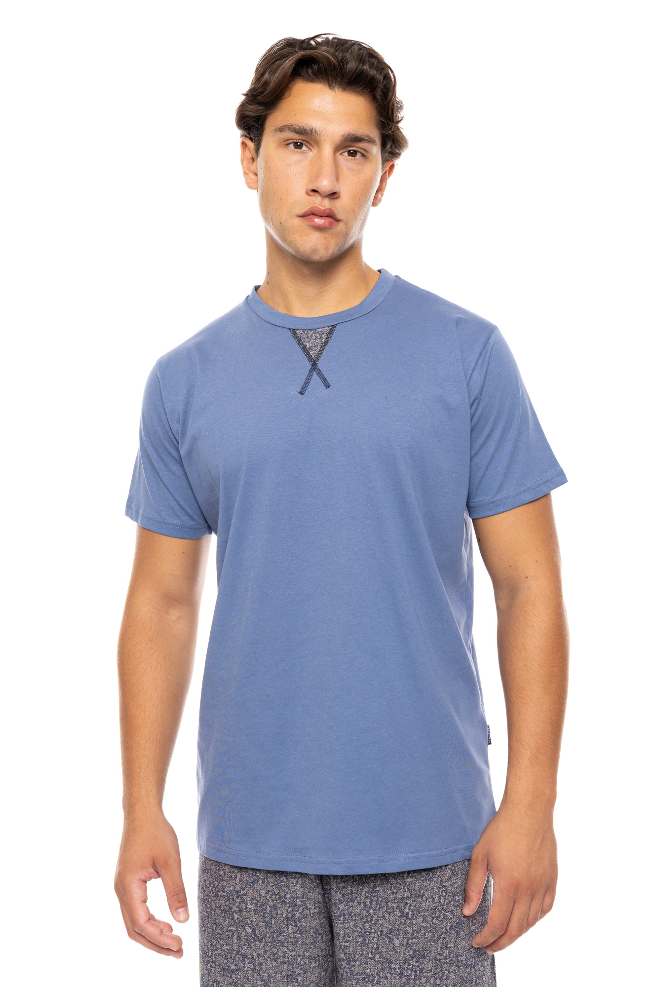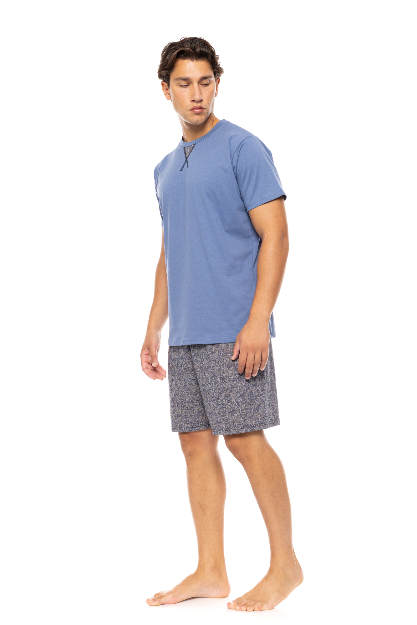 Ανδρική Καλοκαιρινή Πυζάμα Ulisse με μπλε εμπριμέ βερμούδα και Cosmos Blue μπλούζα με κοντό μανίκι και στρογγυλή λαιμόκοψη. Δροσερή και απορροφητική πυτζάμα κατασκευασμένη από από υψηλής ποιότητας βαμβακερό ύφασμα.