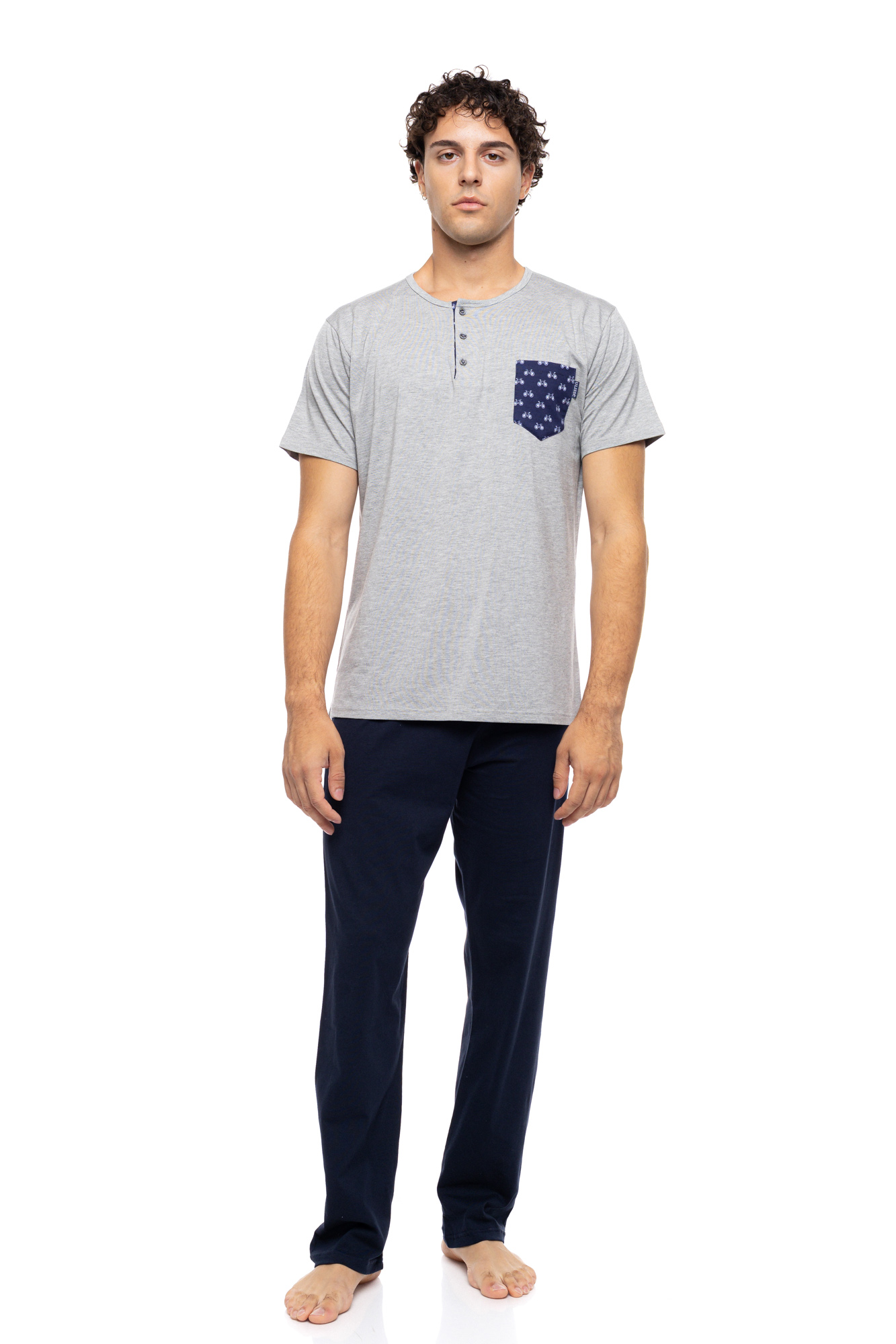 Ανδρική Καλοκαιρινή Πυζάμα Ulisse με μπλε εμπριμέ βερμούδα , μπλέ μακρύ παντελόνι και γκρί μπλούζα με κοντό μανίκι , στρογγυλή λαιμόκοψη και πατιλέτα . Δροσερή και απορροφητική πυτζάμα κατασκευασμένη από από υψηλής ποιότητας βαμβακερό ύφασμα.