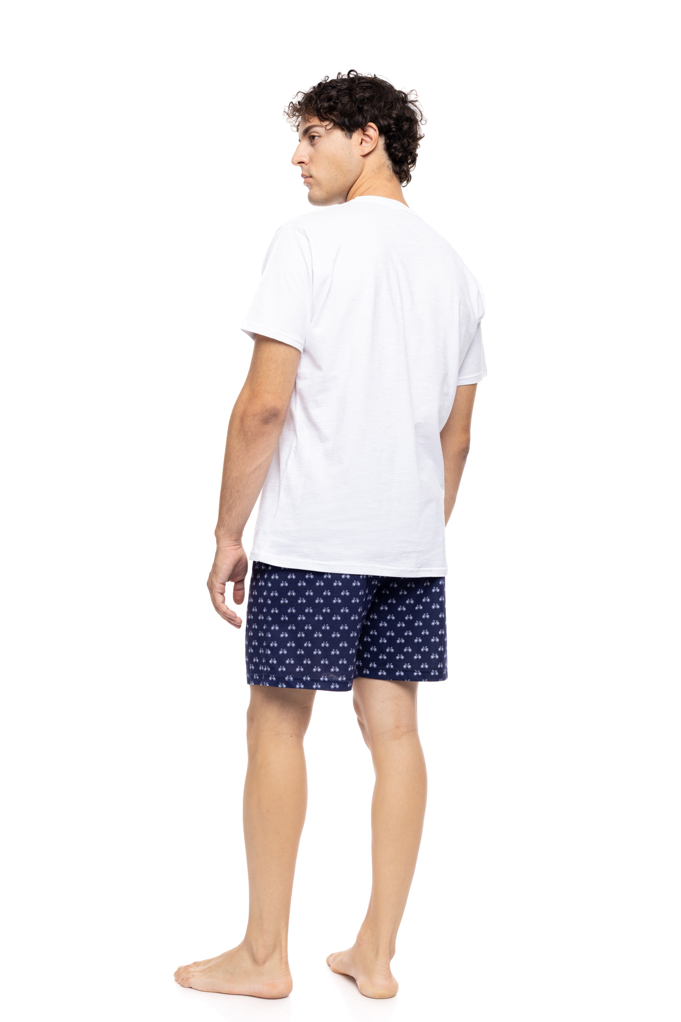 Ανδρική Καλοκαιρινή Πυζάμα Ulisse με μπλε εμπριμέ βερμούδα και λευκή μπλούζα με κοντό μανίκι και στρογγυλή λαιμόκοψη. Δροσερή και απορροφητική πυτζάμα κατασκευασμένη από από υψηλής ποιότητας βαμβακερό ύφασμα.