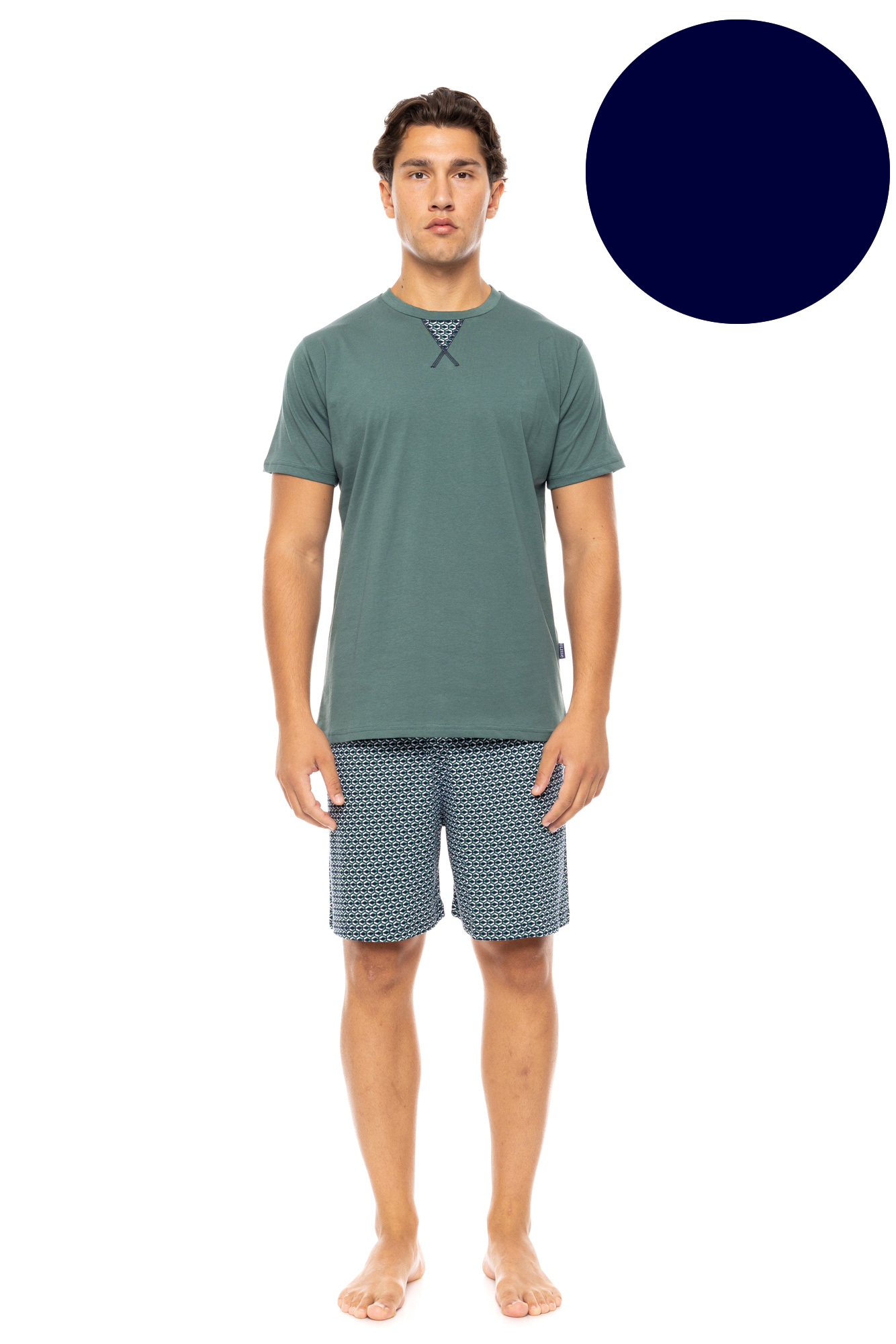 Ανδρική Καλοκαιρινή Πυζάμα Ulisse με εμπριμέ βερμούδα και Yacht Blue μπλούζα με κοντό μανίκι και στρογγυλή λαιμόκοψη. Δροσερή και απορροφητική πυτζάμα κατασκευασμένη από από υψηλής ποιότητας βαμβακερό ύφασμα.