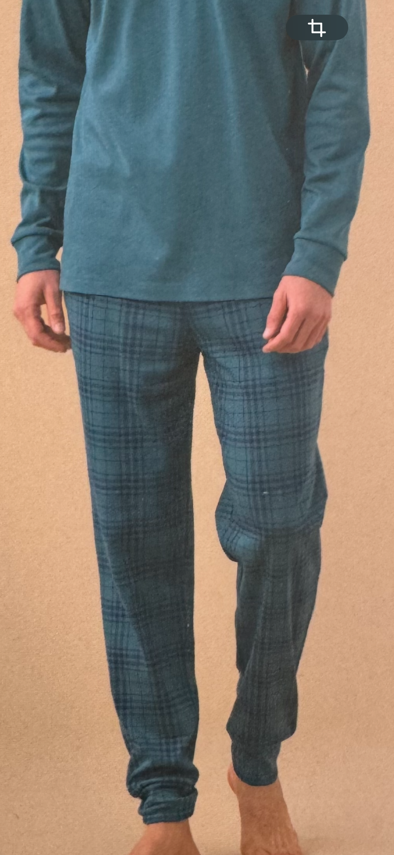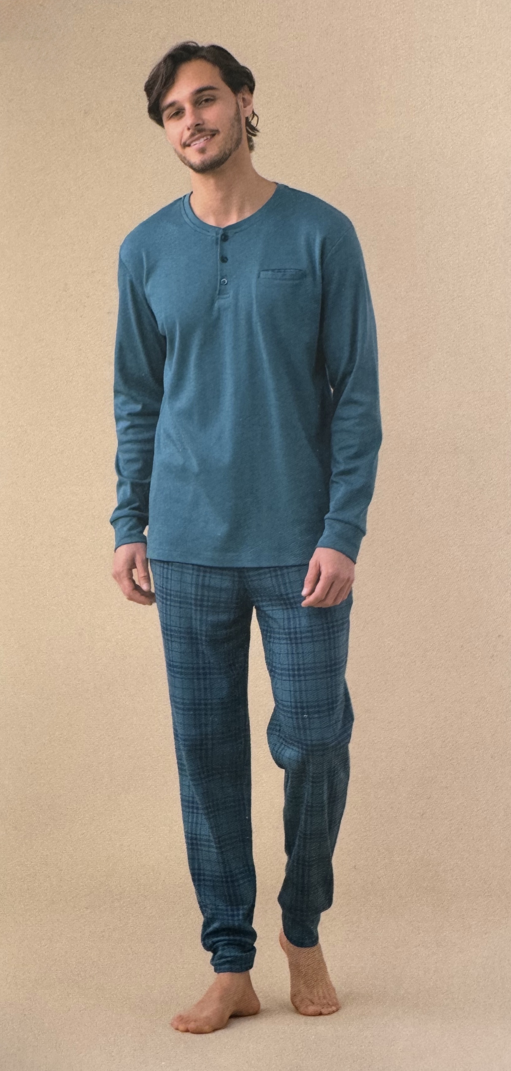 Ανδρική χειμωνιάτικη πυτζάμα Noidinotte βαμβακερή. Homewear Set με μακρυμάνικη μπλούζα μπλε με στρογγυλή λαιμόκοψη, και τσέπη στο στήθος. Παντελόνι πράσινο καρό με μαλακό λάστιχο στην μέση και στους αστραγάλους.