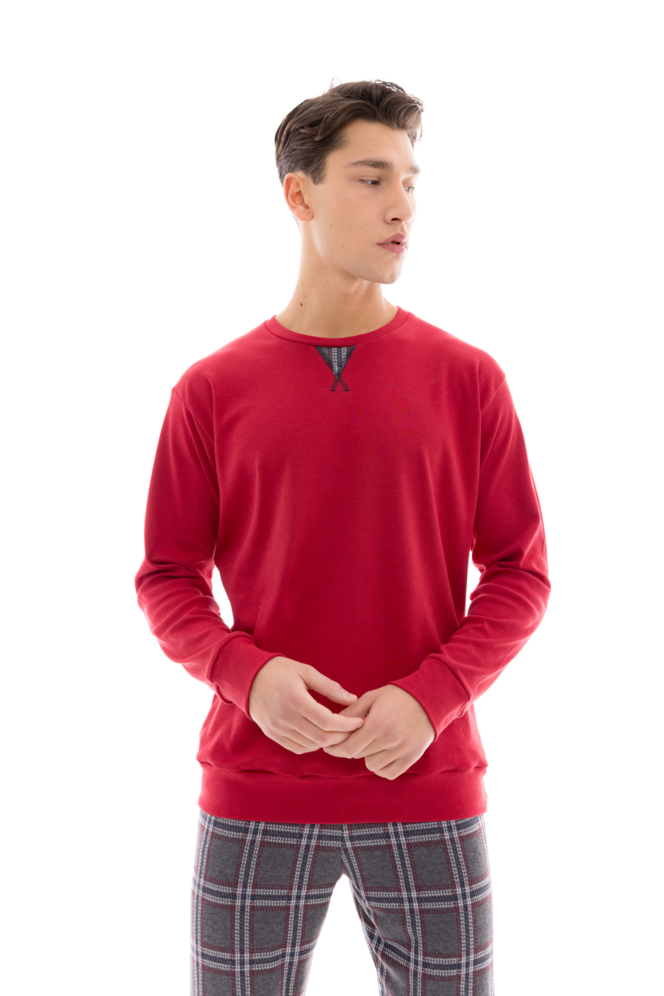 Ανδρική πυτζάμα Pink Label με γκρι καρό παντελόνι σε ίσια γραμμή, στενό στο τελείωμα και μαλακό λάστιχο στην μέση. Χειμωνιάτικο Homewear Set με μακρυμάνικη μπλούζα κόκκινη και στρογγυλή λαιμόκοψη με καρό σχέδιο.