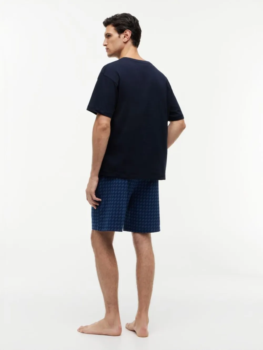 Ανδρική πυτζάμα Tommy Hilfiger βαμβακερή, Regular Fit. Καλοκαιρινό Homewear Set με κοντομάνικη μπλούζα μπλε με στρογγυλή λαιμόκοψη και κεντημένο logo στο στήθος. Παντελόνι σε ίσια γραμμή εμπριμέ , logo και μαλακό λάστιχο στην μέση.