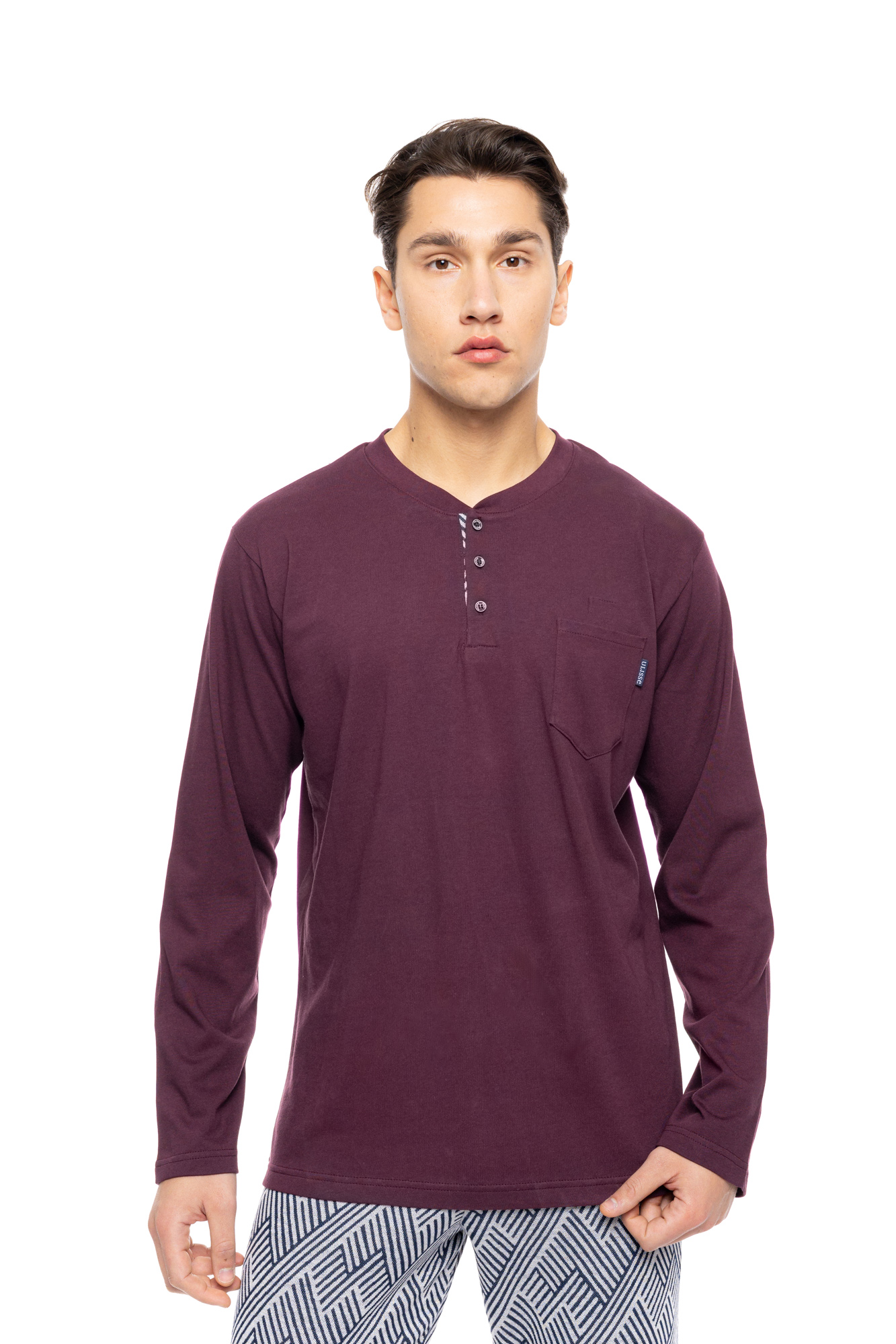 Ανδρική πυτζάμα ULISSE HENRY STRIPES παντελόνι με μαλακό λάστιχο στην μέση. Χειμωνιάτικο Homewear Set με Bordo μπλούζα, κουμπιά και τσέπη στο στήθος.
