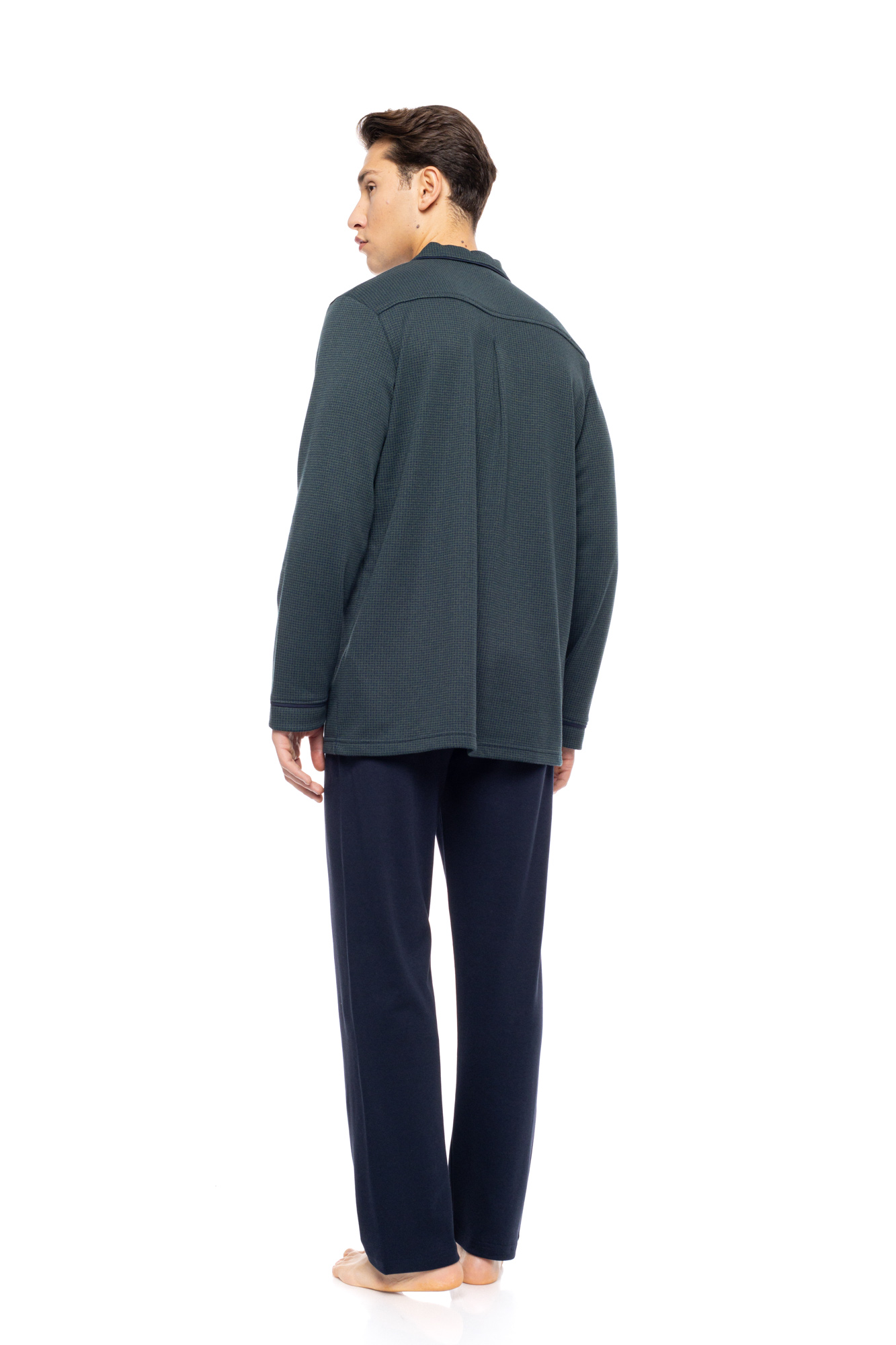 Ανδρική πυτζάμα ULISSE με navy παντελόνι σε ίσια γραμμή και μαλακό λάστιχο στην μέση. Χειμωνιάτικο Homewear Set με κυπαρισσί μακρυμάνικο πουκάμισο με τσέπη και γιακά.