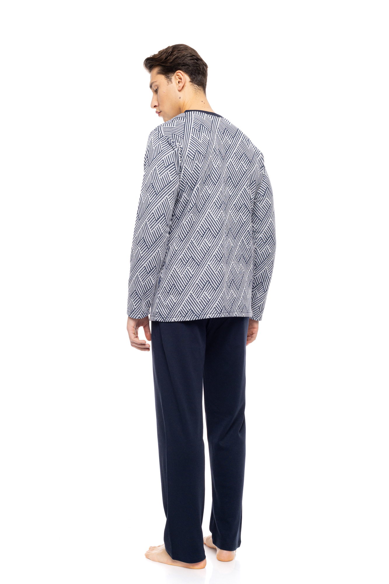 Ανδρική πυτζάμα ULISSE με navy παντελόνι με μαλακό λάστιχο στην μέση. Χειμωνιάτικο Homewear Set με HENRY STRIPES μπλούζα, κουμπιά και τσέπη στο στήθος.