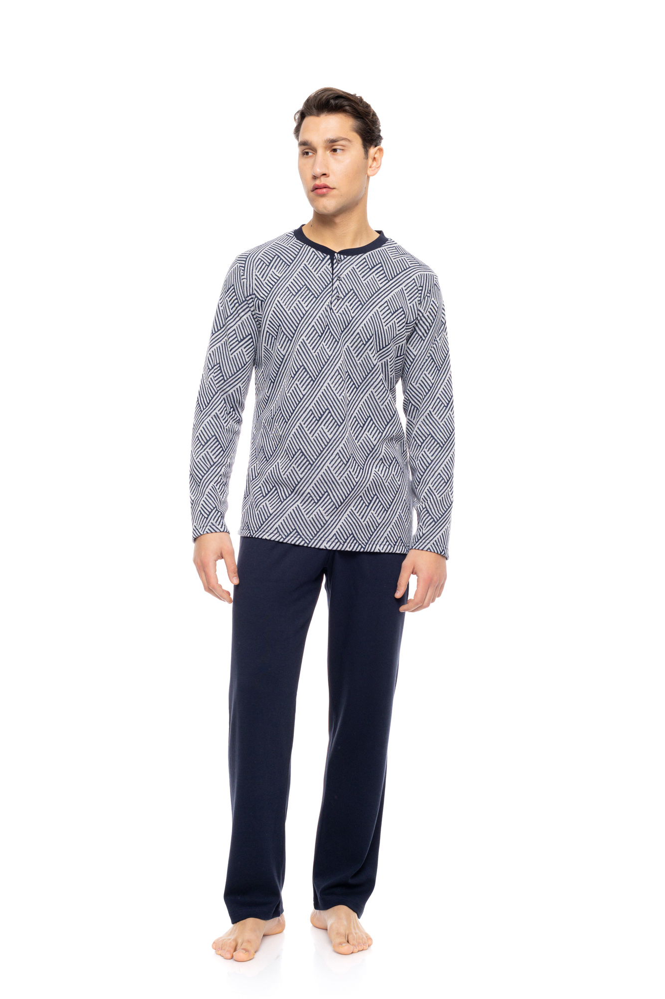 Ανδρική πυτζάμα ULISSE με navy παντελόνι με μαλακό λάστιχο στην μέση. Χειμωνιάτικο Homewear Set με HENRY STRIPES μπλούζα, κουμπιά και τσέπη στο στήθος.
