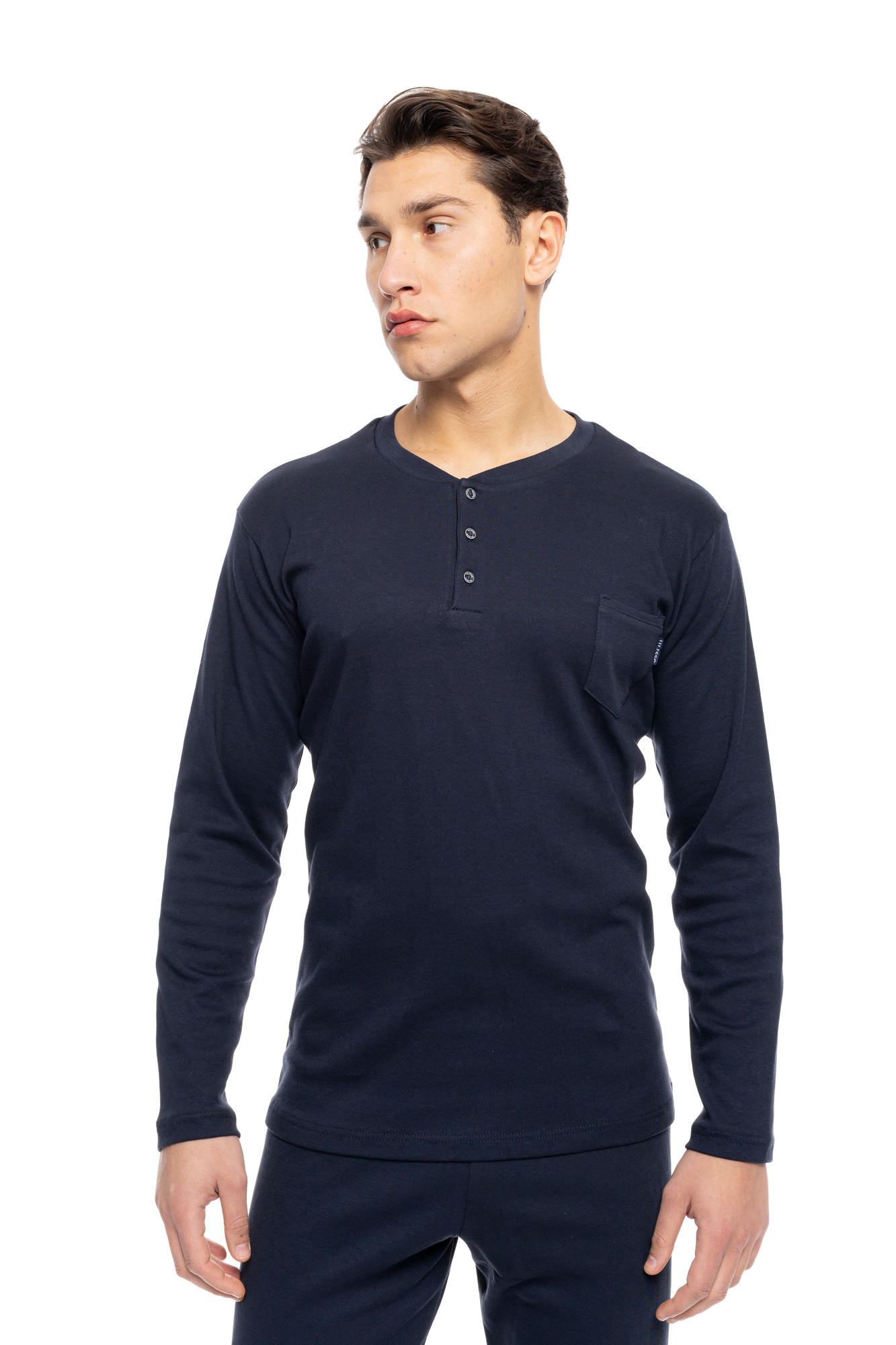 Ανδρική πυτζάμα ULISSE με μπλε παντελόνι με μαλακό λάστιχο στην μέση. Χειμωνιάτικο Homewear Set με Indigo Blue μακρυμάνικη μπλούζα, με κουμπιά στο στήθος  και στρογγυλή λαιμόκοψη.