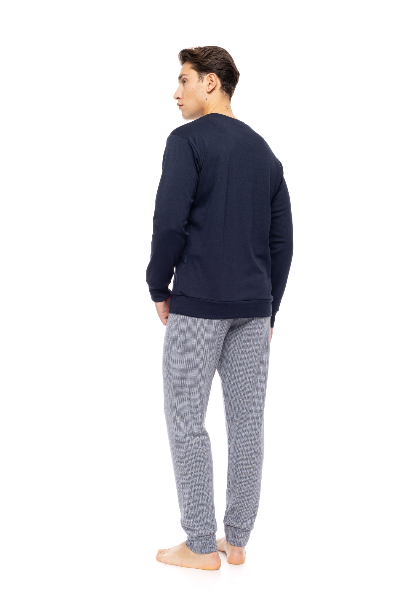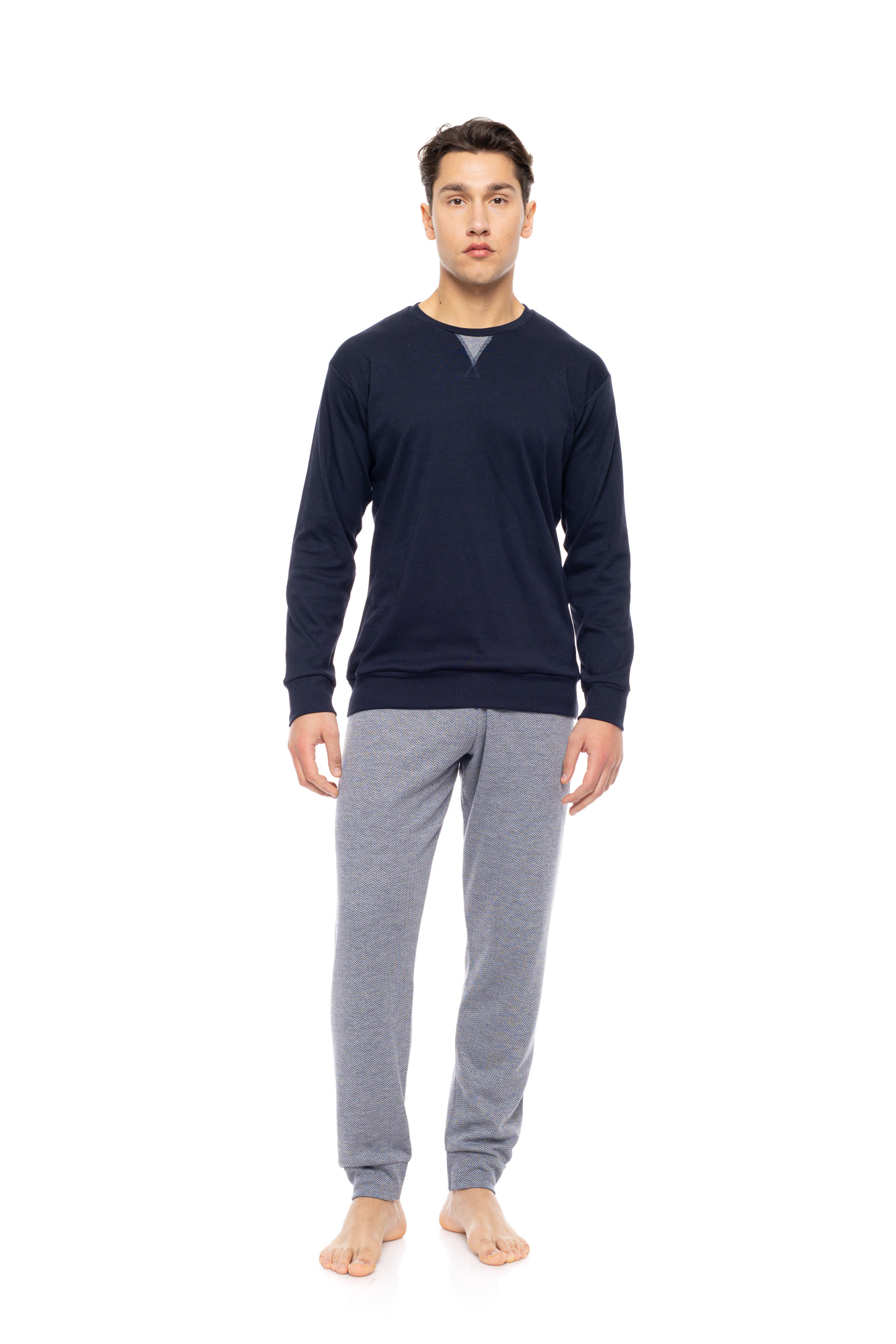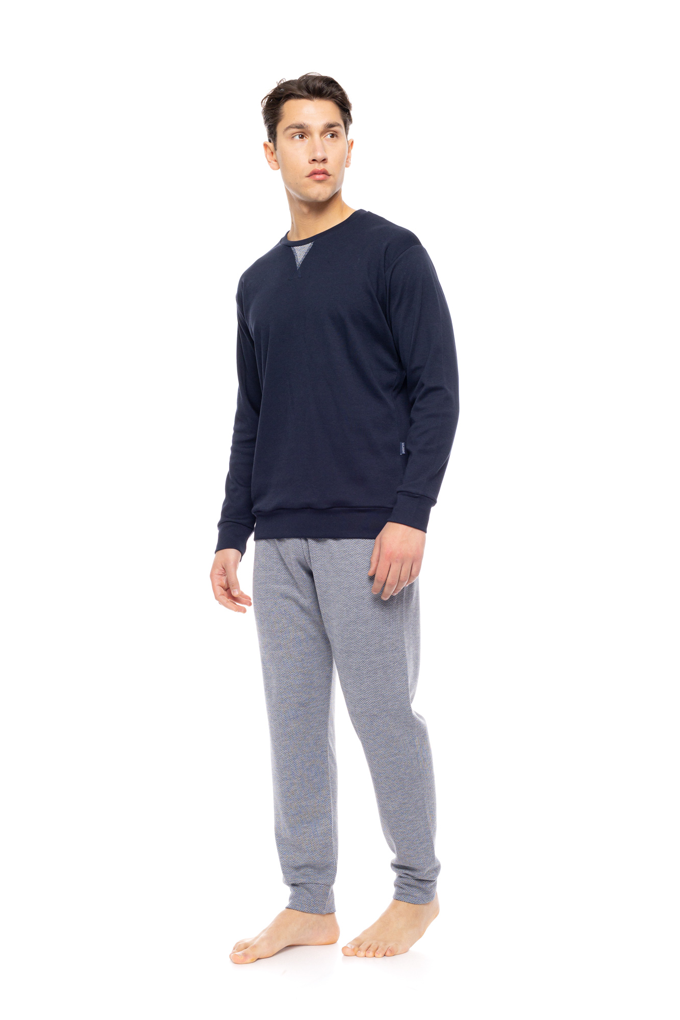 Ανδρική πυτζάμα ULISSE με MOSAIC DENIM παντελόνι σε ίσια γραμμή και μαλακό λάστιχο στην μέση και στους ασταγάλους. Χειμωνιάτικο Homewear Set με navy μακρυμάνικη μπλούζα με στρογγυλή λαιμόκοψη και λάστιχο στα τελειώματα.