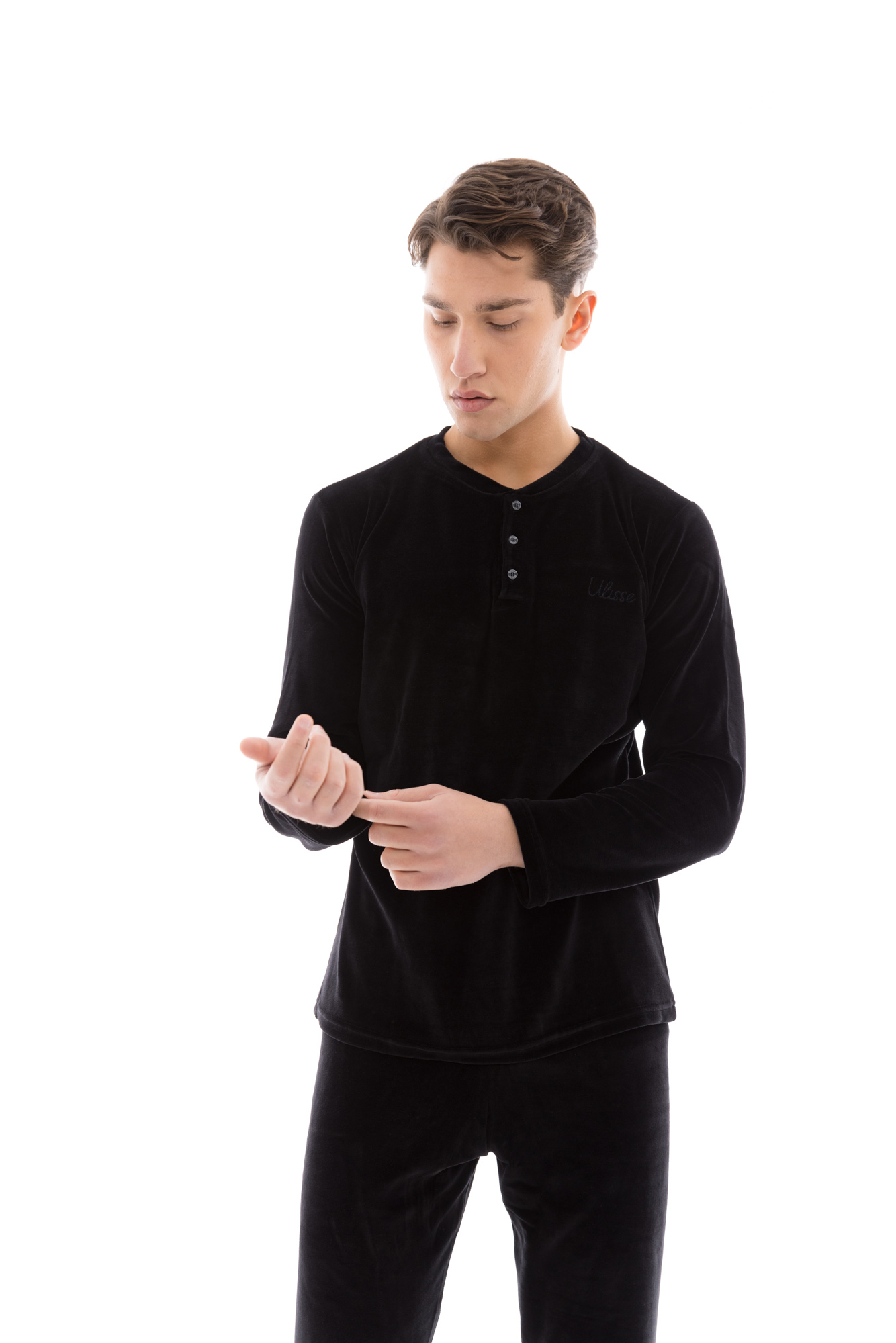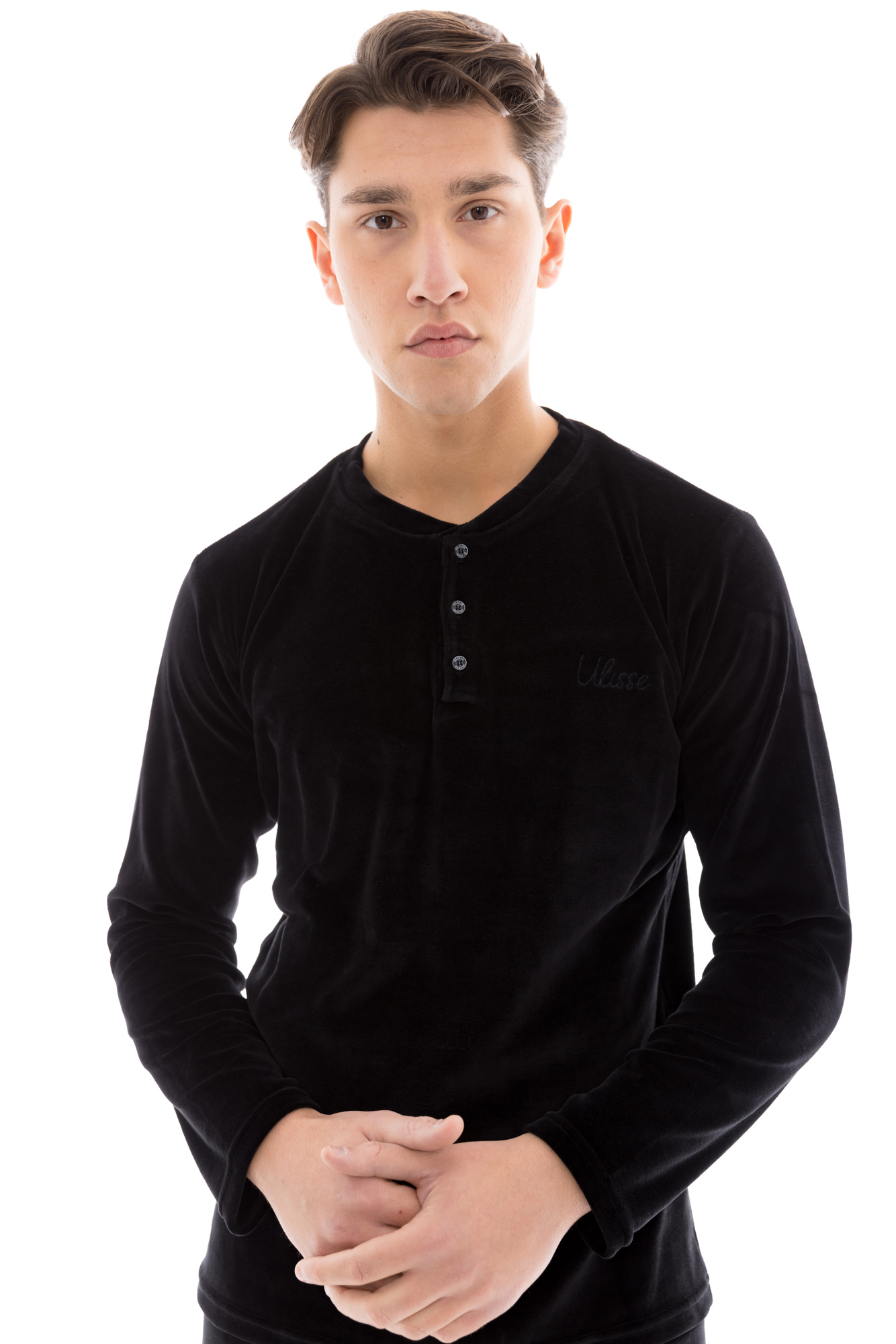 Ανδρική πυτζάμα ULISSE με μαύρο παντελόνι Βελούδο. Χειμωνιάτικο Homewear Set με μαύρη μακρυμάνικη μπλούζα  Βελούδο , με κουμπιά στο στήθος  και στρογγυλή λαιμόκοψη.