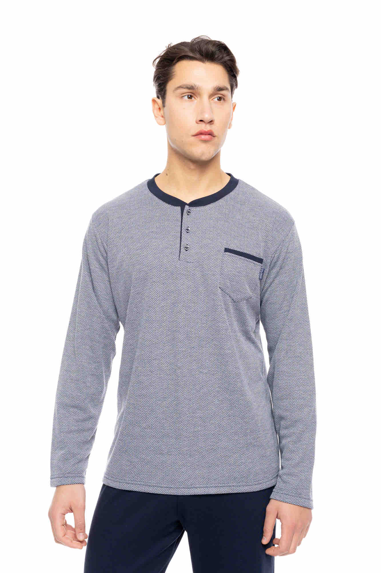 Ανδρική πυτζάμα ULISSE με navy παντελόνι με μαλακό λάστιχο στην μέση. Χειμωνιάτικο Homewear Set με MOSAIC DENIM μπλούζα με κουμπιά και τσέπη στο στήθος.