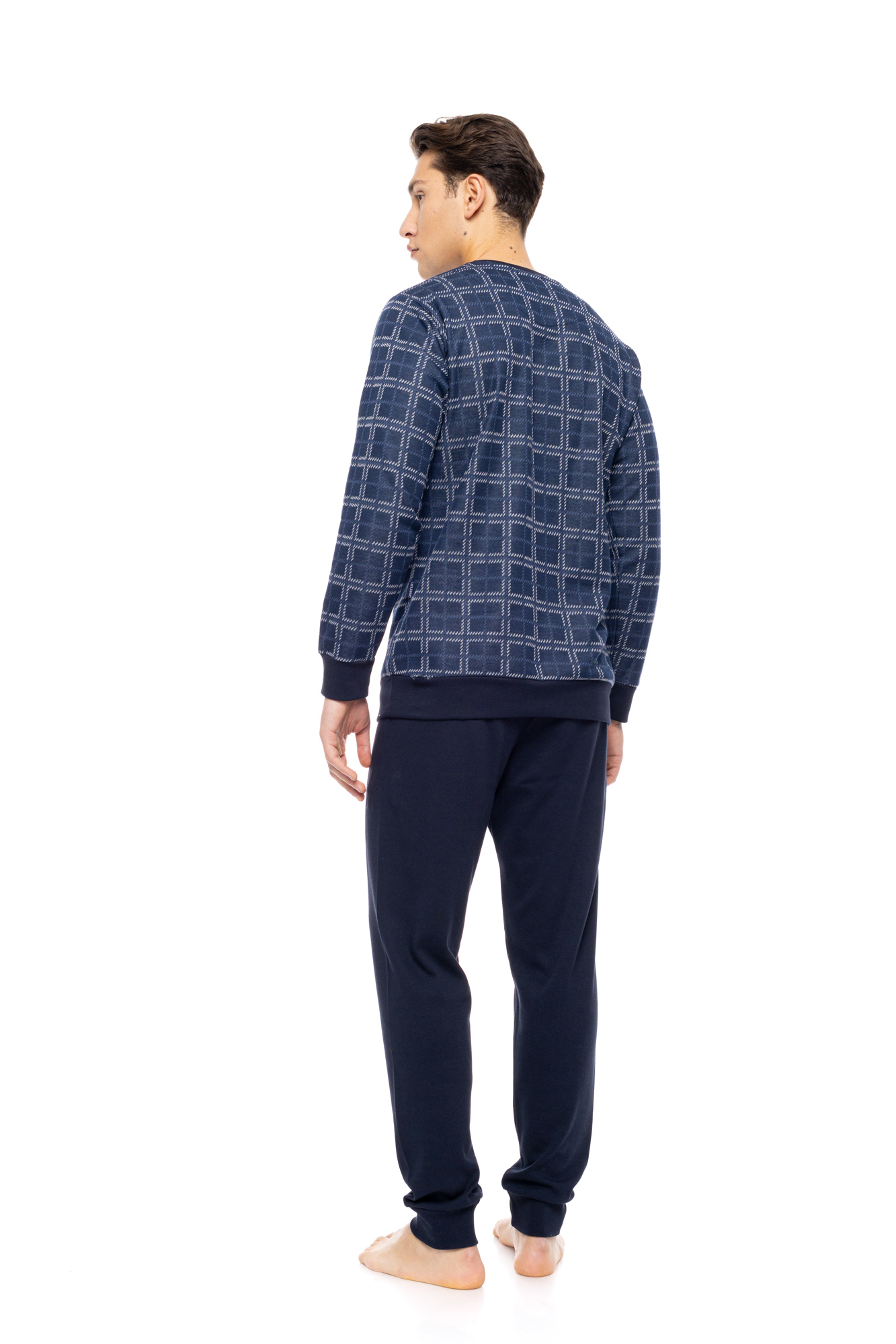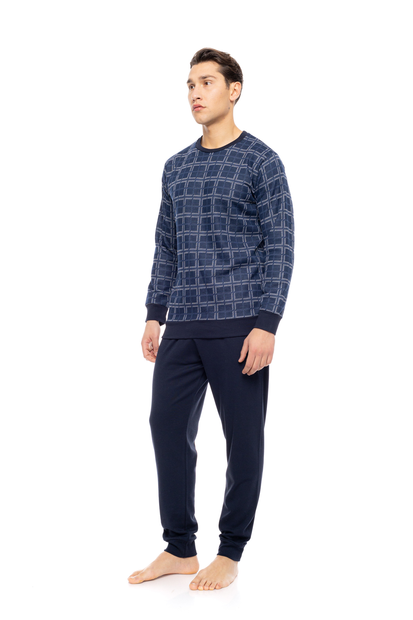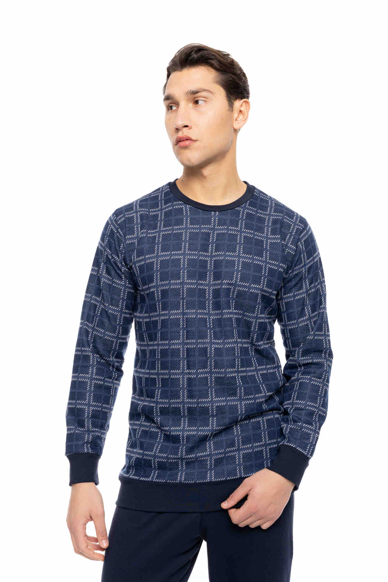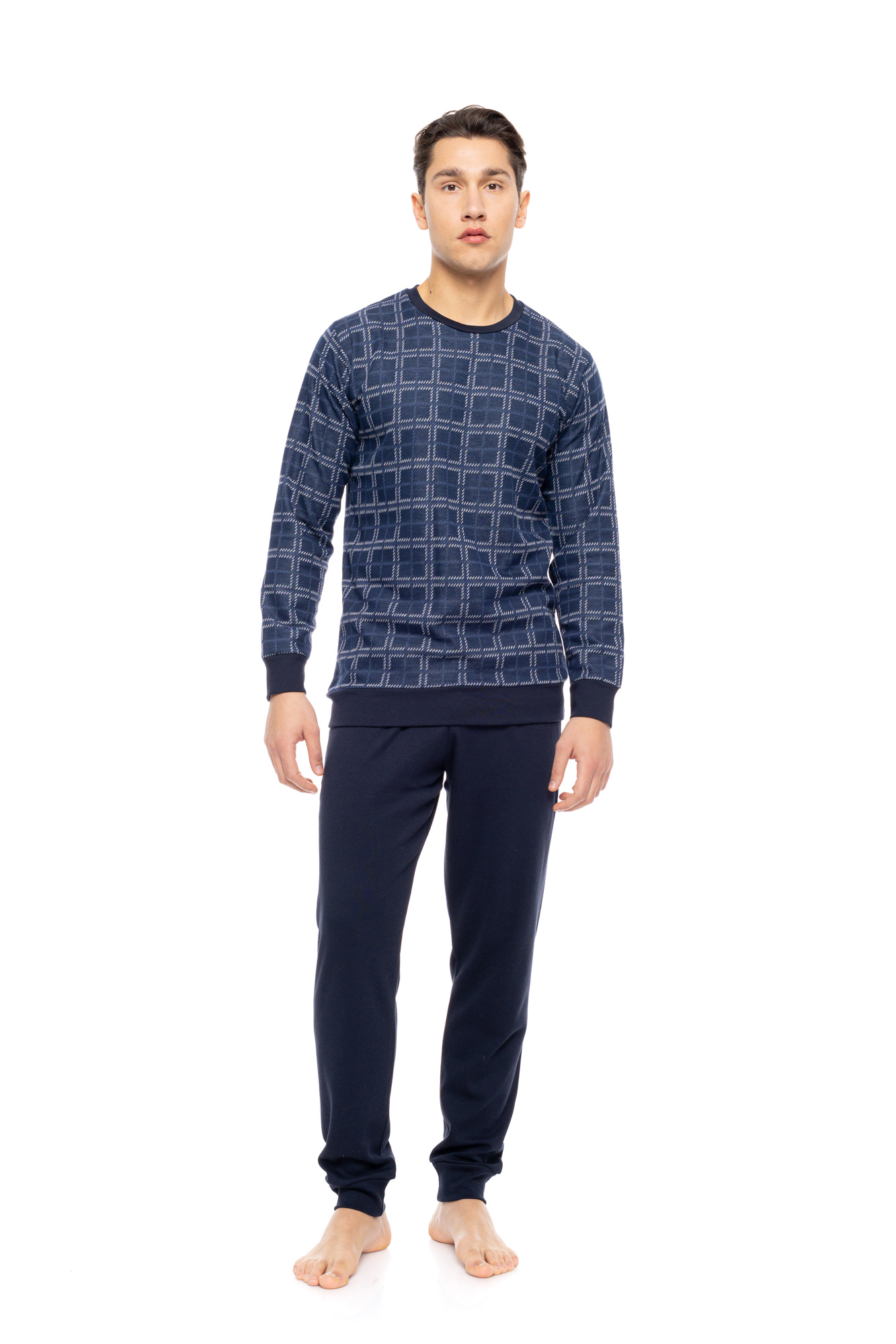 Ανδρική πυτζάμα ULISSE με navy παντελόνι σε ίσια γραμμή και μαλακό λάστιχο στην μέση και στους ασταγάλους. Χειμωνιάτικο Homewear Set με μπλε καρό print μακρυμάνικη μπλούζα με στρογγυλή λαιμόκοψη και λάστιχο στα τελειώματα.