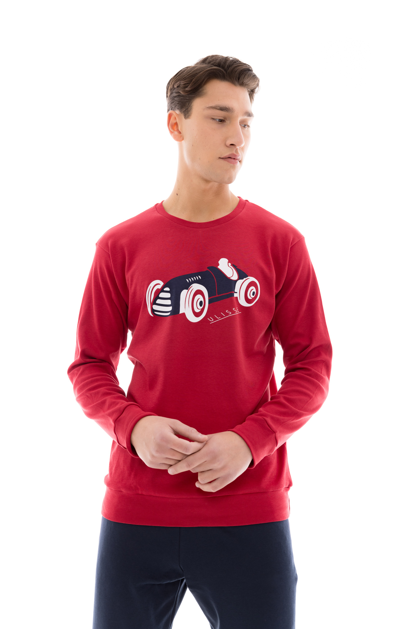 Ανδρική πυτζάμα ULISSE με μπλε παντελόνι με μαλακό λάστιχο στην μέση και στους αστραγάλους. Χειμωνιάτικο Homewear Set με μπορντο μακρυμάνικη μπλούζα με τύπωμα μπροστά, λάστιχο στα τελειώματα και στρογγυλή λαιμόκοψη.