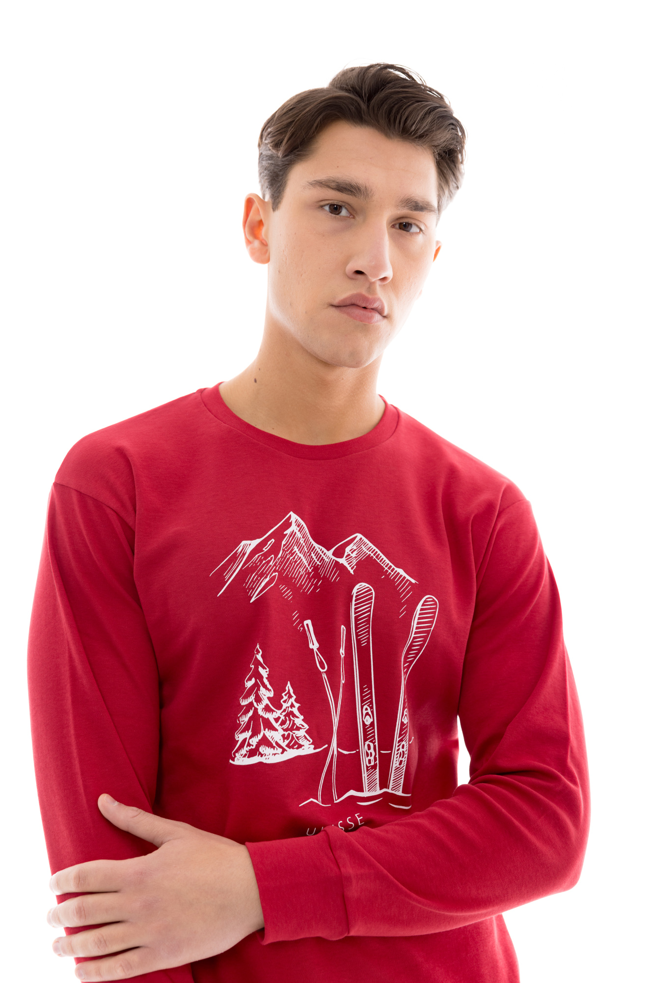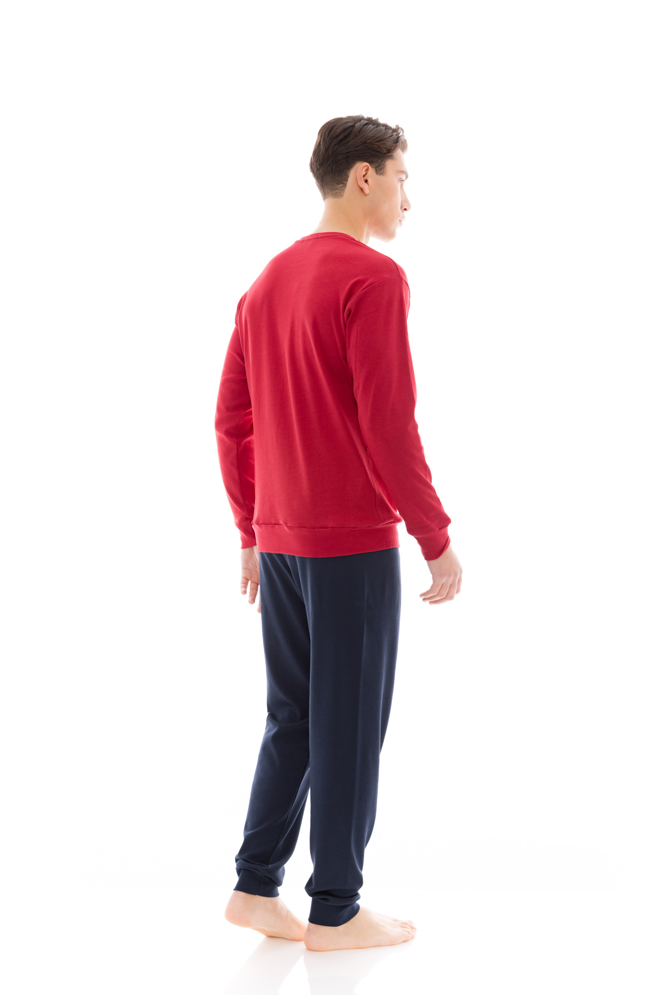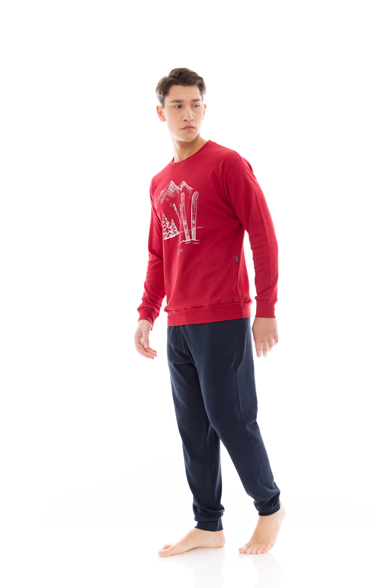 Ανδρική πυτζάμα ULISSE με μπορντό παντελόνι με μαλακό λάστιχο στην μέση και στους αστραγάλους. Χειμωνιάτικο Homewear Set με μπλε μακρυμάνικη μπλούζα με τύπωμα μπροστά, μανσέτες και στρογγυλή λαιμόκοψη.