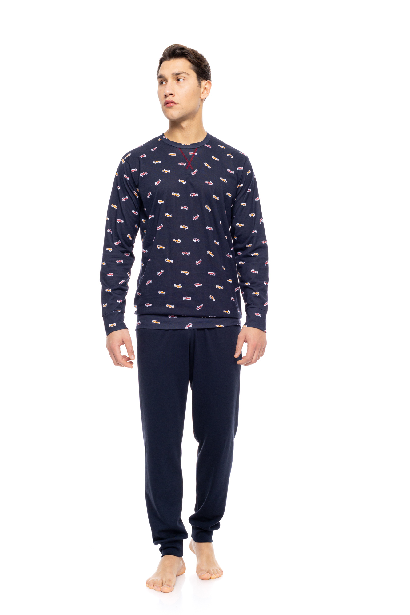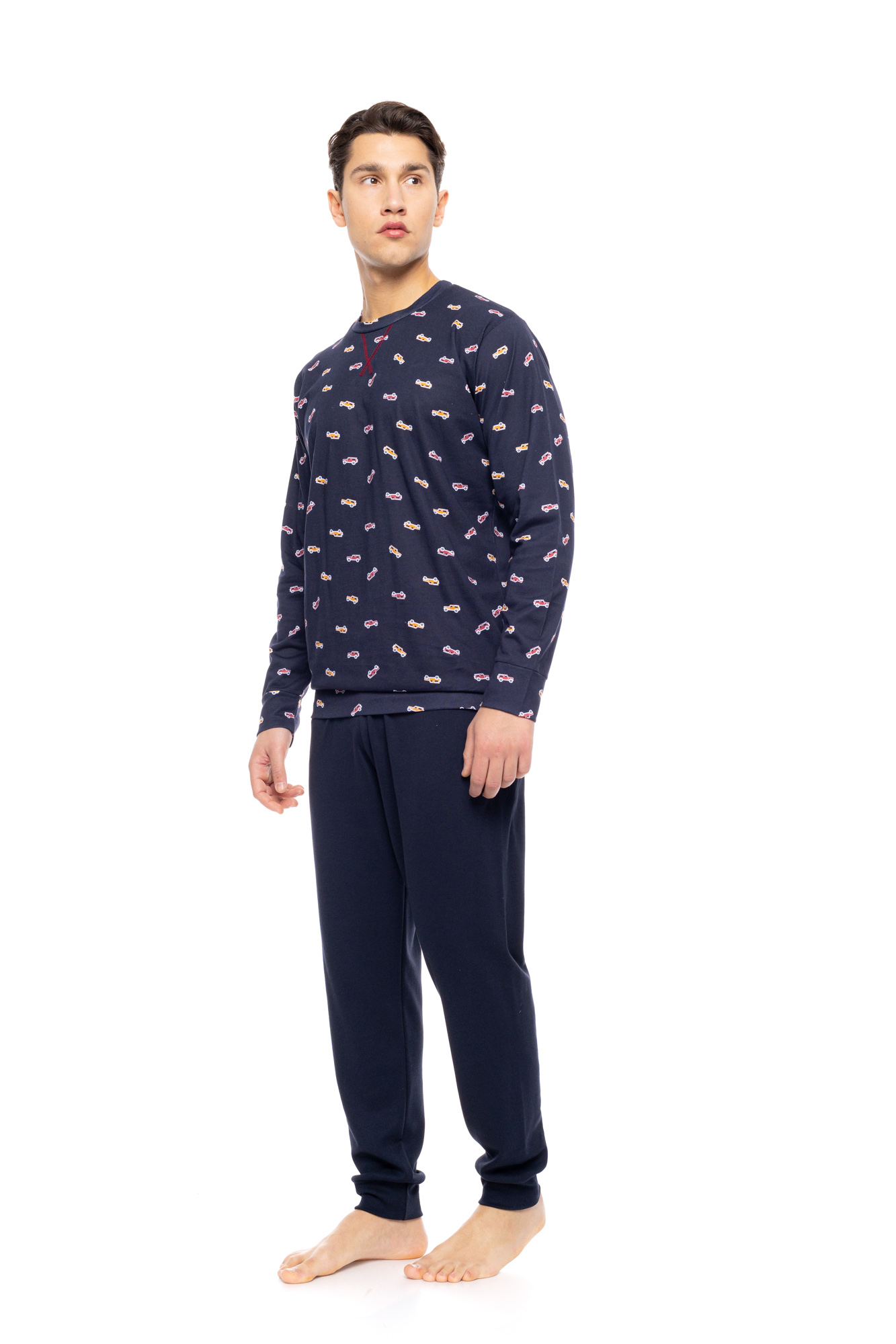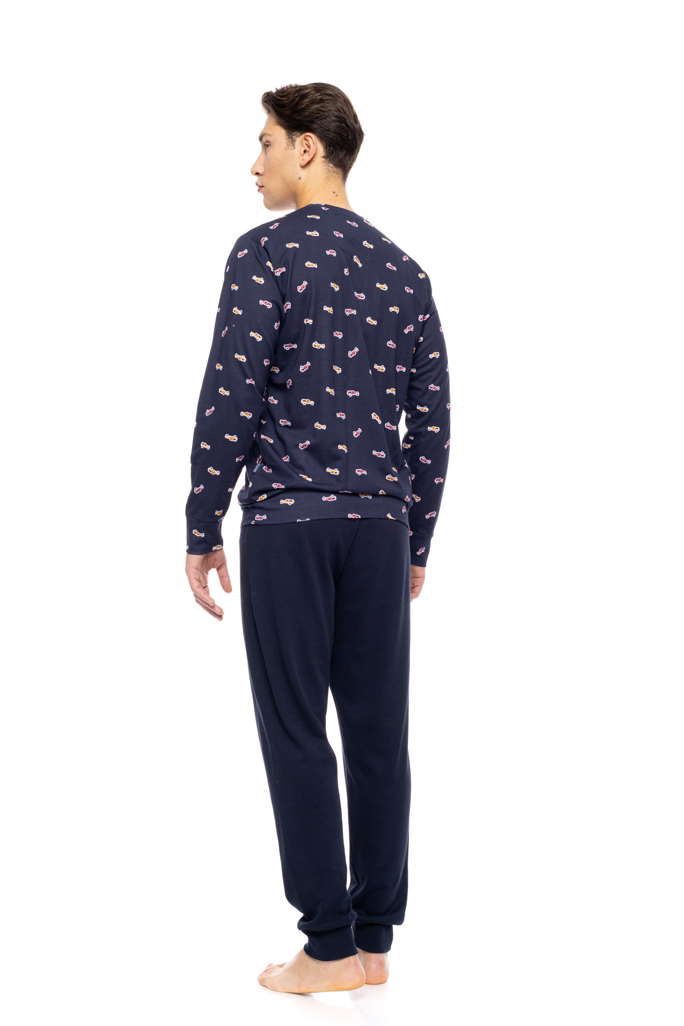 Ανδρική πυτζάμα ULISSE με μπλε παντελόνι με μαλακό λάστιχο στην μέση και στους αστραγάλους. Χειμωνιάτικο Homewear Set με navy μακρυμάνικη μπλούζα print αυτοκίνητα, λάστιχο στα τελειώματα και στρογγυλή λαιμόκοψη.
