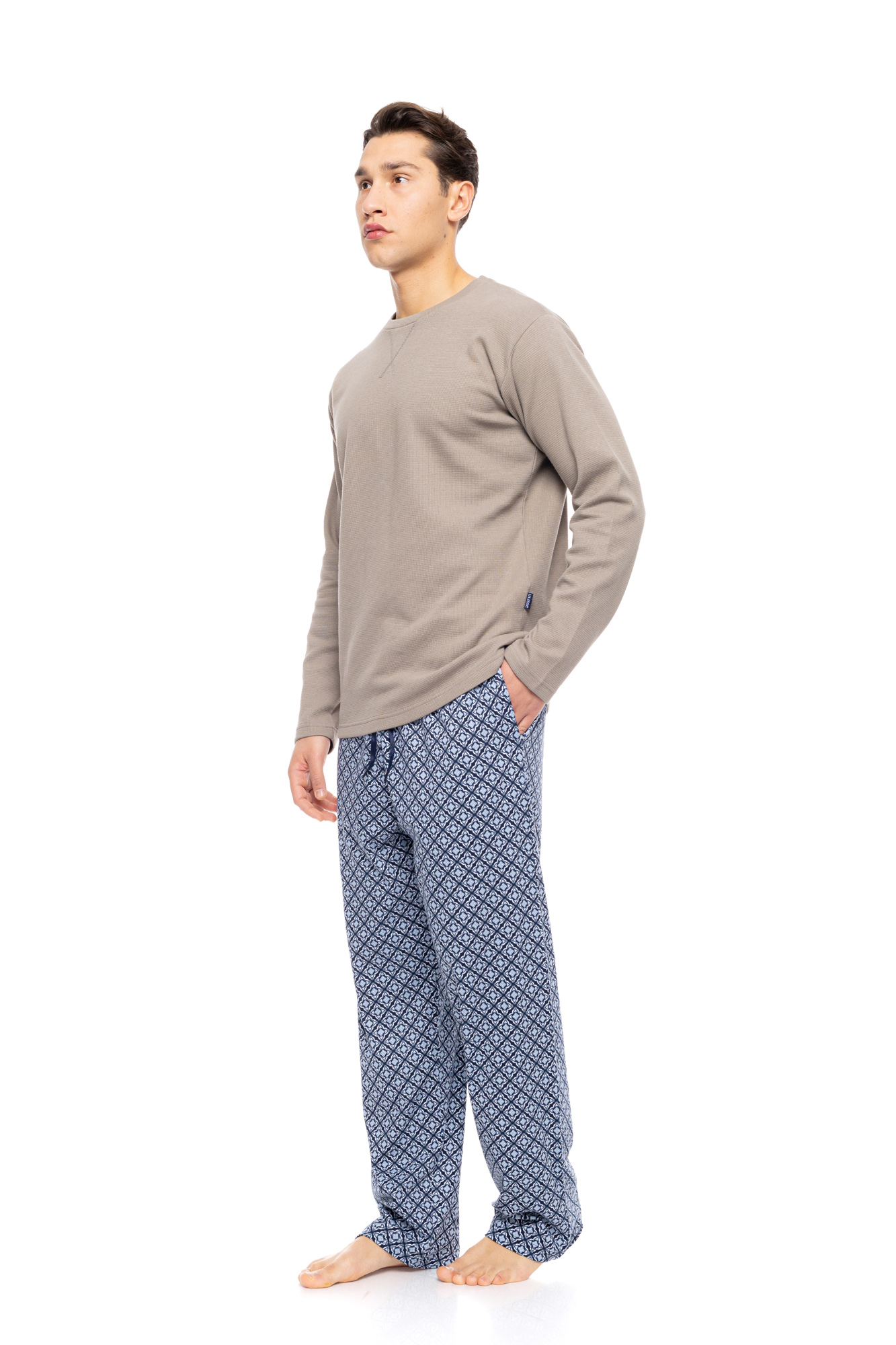 Ανδρική πυτζάμα ULISSE με OCEAN BLUE Geo Print παντελόνι σε ίσια γραμμή και μαλακό λάστιχο στην μέση. Χειμωνιάτικο Homewear Set με skin μακρυμάνικη μπλούζα σε ίσια γραμμή με στρογγυλή λαιμόκοψη.