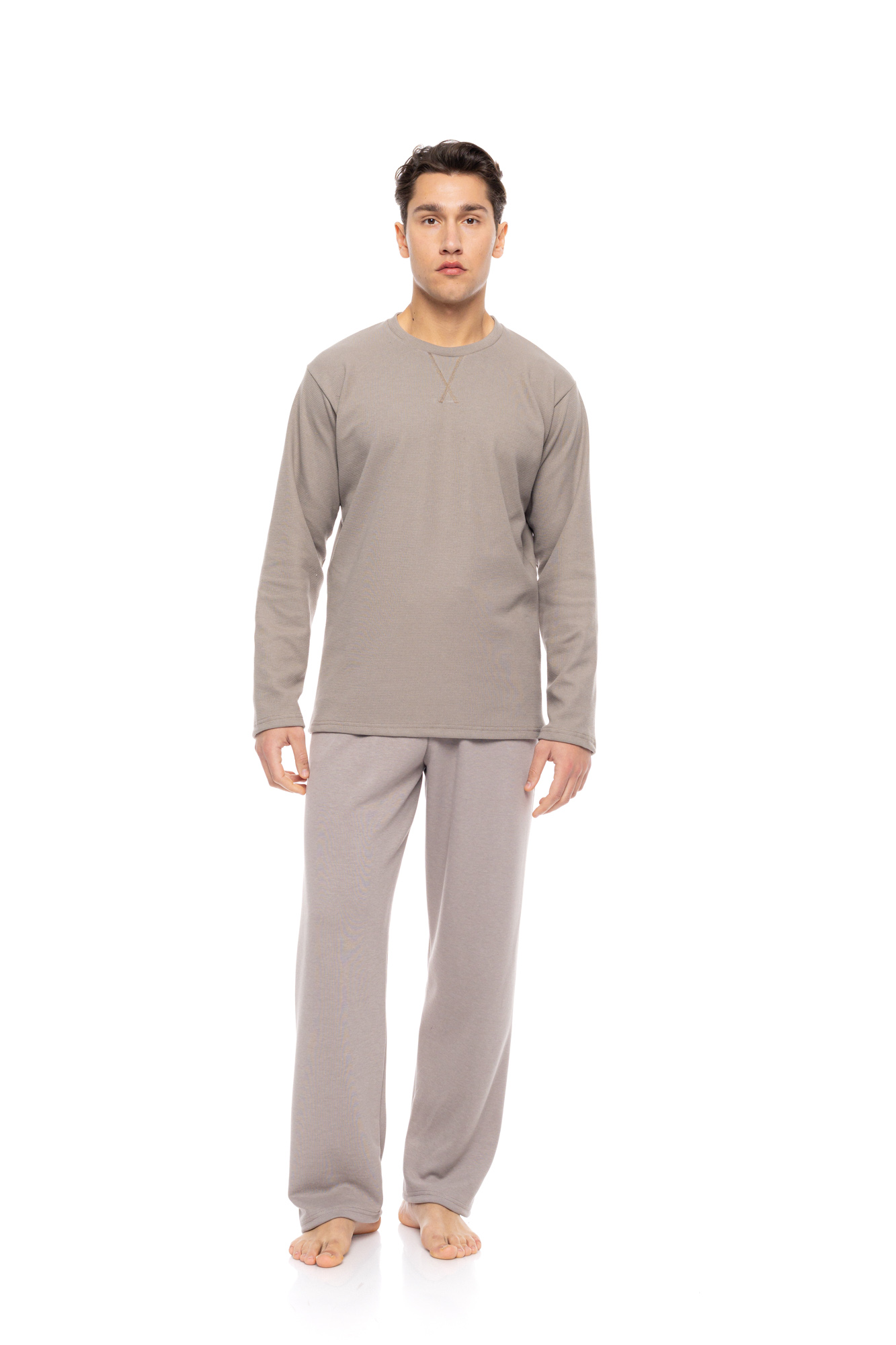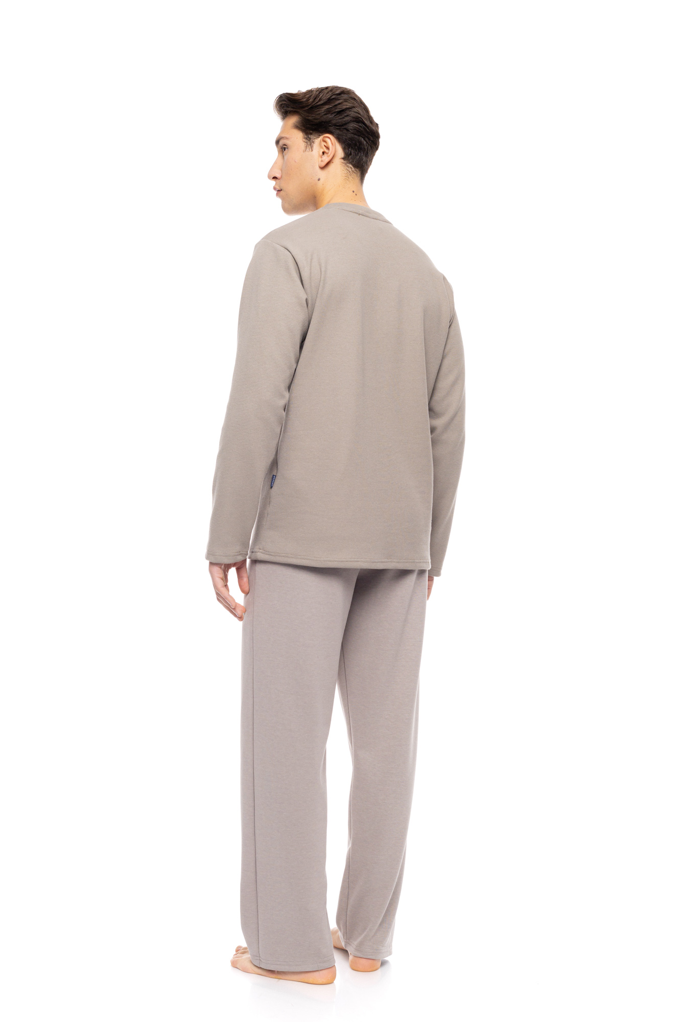 Ανδρική πυτζάμα ULISSE με παντελόνι σε ίσια γραμμή και μαλακό λάστιχο στην μέση. Χειμωνιάτικο Homewear Set με Sand μακρυμάνικη μπλούζα σε ίσια γραμμή με στρογγυλή λαιμόκοψη.