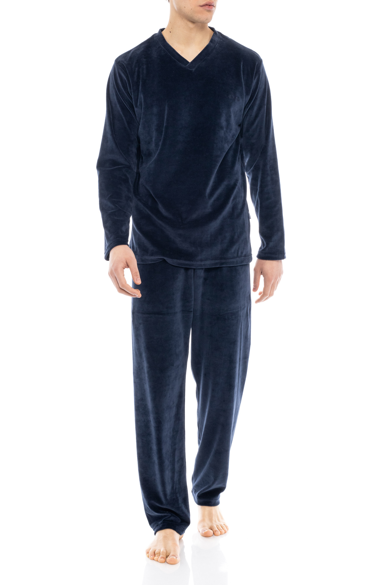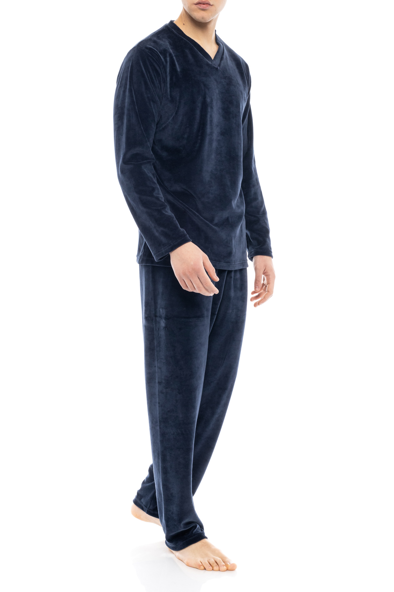 Ανδρική πυτζάμα ULISSE από ζεστό Yacht Blue Βελόυδο V-Neck με παντελόνι σε ίσια γραμμή με μαλακό λάστιχο στην μέση.
