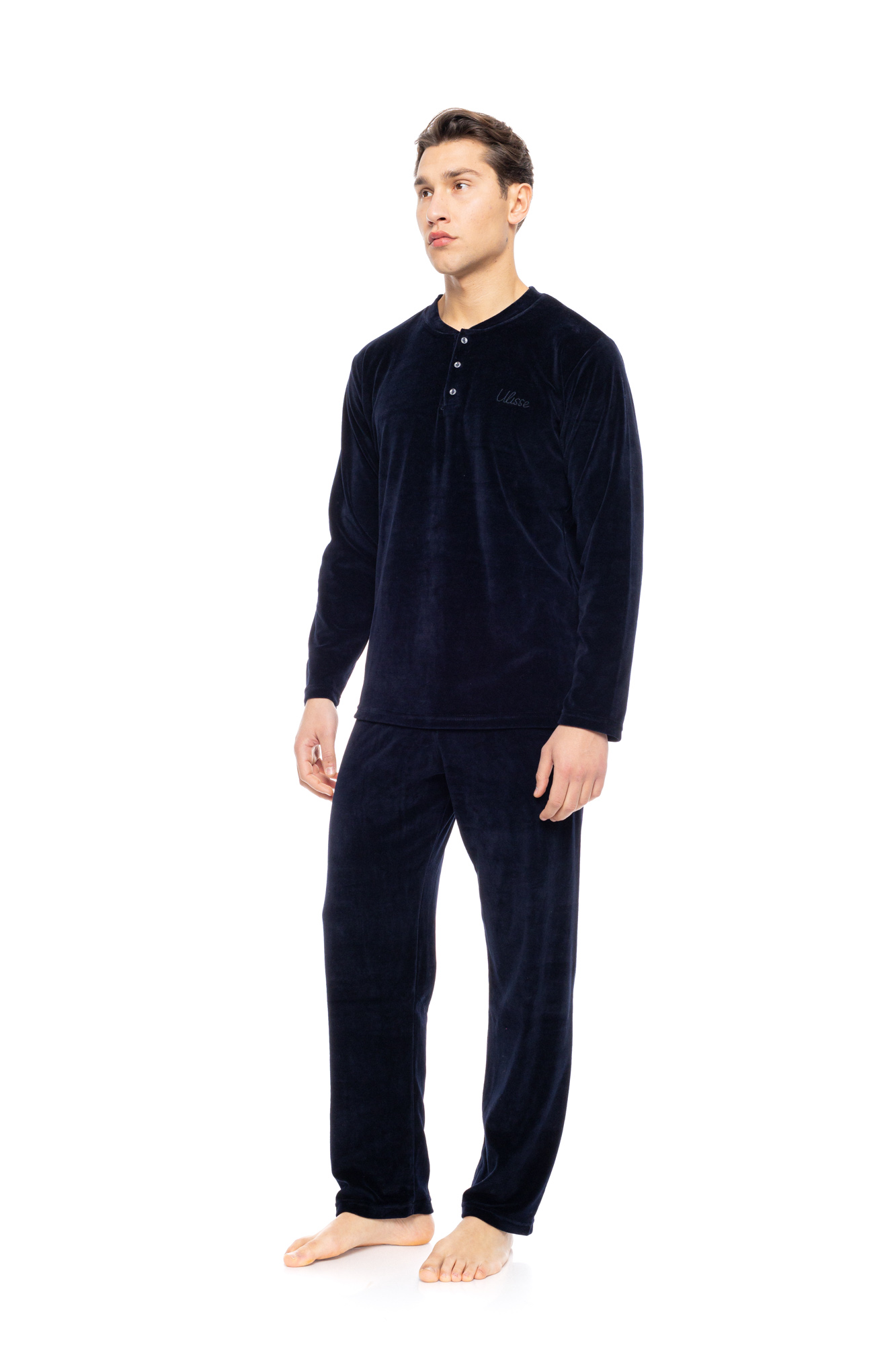 Ανδρική πυτζάμα ULISSE με Yacht Blue παντελόνι Βελούδο. Χειμωνιάτικο Homewear Set με Yacht Blue μακρυμάνικη μπλούζα  Βελούδο , με κουμπιά στο στήθος  και στρογγυλή λαιμόκοψη.