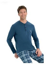 Ανδρική Πυζάμα POLEREN - Μπλε Μπλούζα - Εμπριμέ Καρό Μπλε Παντελόνι σε Κανονική Γραμμή από 100% Βαμβάκι και κανονικό τελείωμα στο παντελόνι χωρίς λάστιχο.