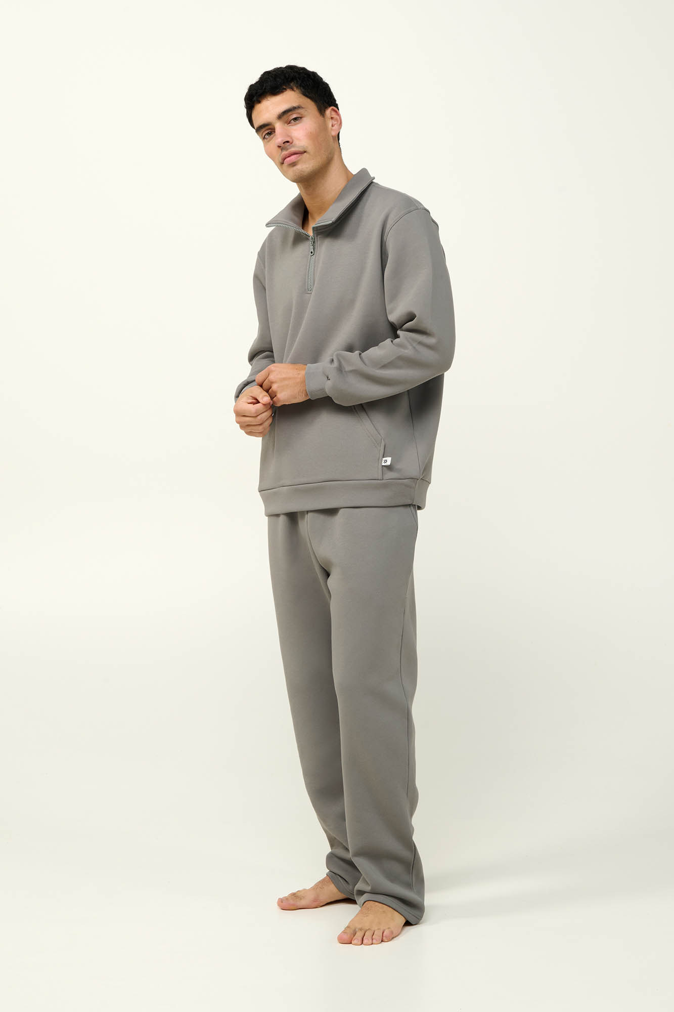 Αυτή η ανδρική χειμερινή φόρμα συνδυάζει ζεστή αίσθηση με χαλαρό στυλ. Κατασκευασμένη από απαλό φούτερ ύφασμα, διαθέτει φερμουάρ στη λαιμόκοψη και μανίκια με μανσέτες για άνετη εφαρμογή και ελευθερία κινήσεων. Η μπροστινή τσέπη-καγκουρό προσθέτει πρακτικότητα, κάνοντας την μια ιδανική επιλογή για χαλαρές στιγμές στο σπίτι ή casual εμφανίσεις τις κρύες μέρες του χειμώνα.