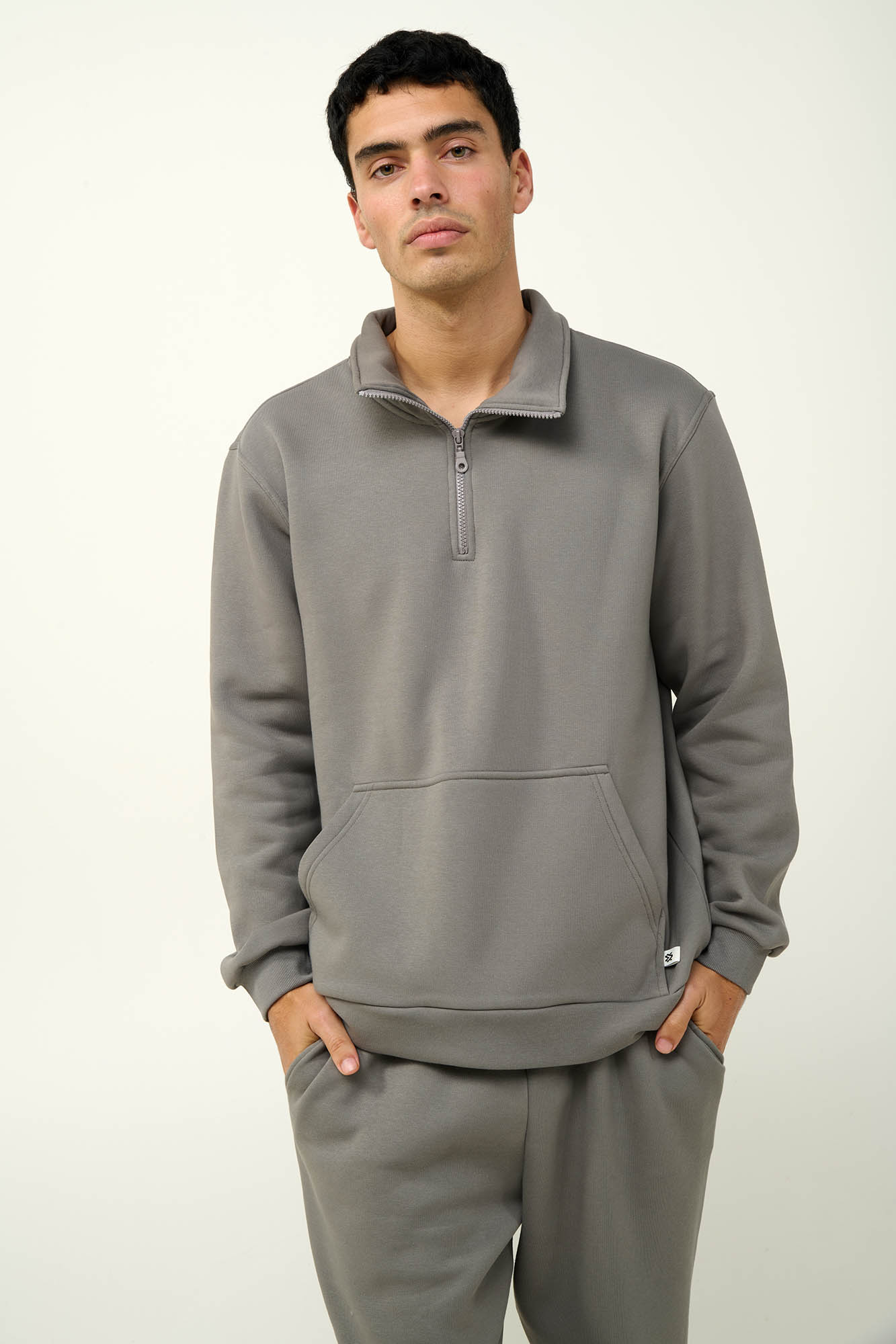 Αυτή η ανδρική χειμερινή φόρμα συνδυάζει ζεστή αίσθηση με χαλαρό στυλ. Κατασκευασμένη από απαλό φούτερ ύφασμα, διαθέτει φερμουάρ στη λαιμόκοψη και μανίκια με μανσέτες για άνετη εφαρμογή και ελευθερία κινήσεων. Η μπροστινή τσέπη-καγκουρό προσθέτει πρακτικότητα, κάνοντας την μια ιδανική επιλογή για χαλαρές στιγμές στο σπίτι ή casual εμφανίσεις τις κρύες μέρες του χειμώνα.