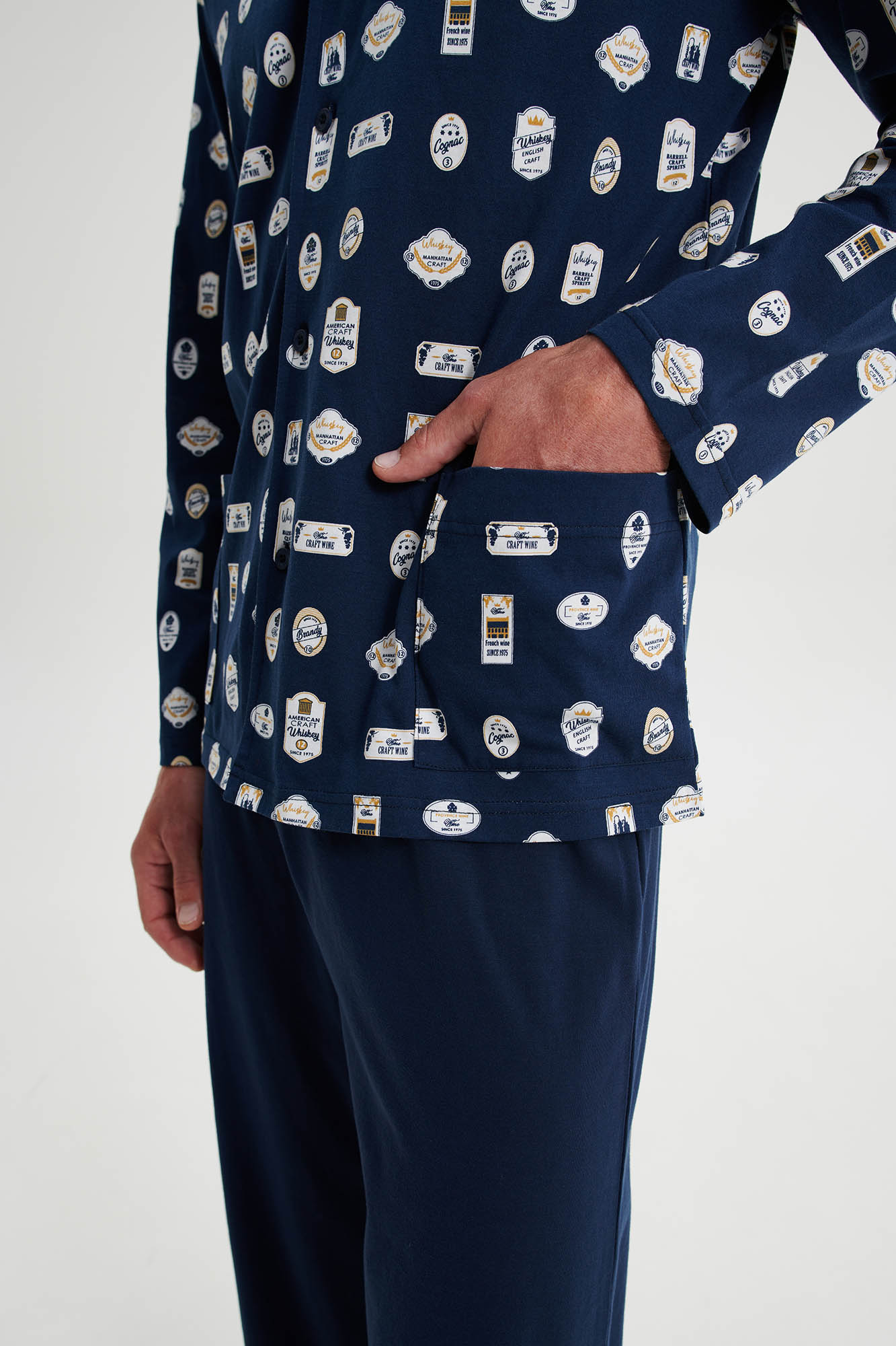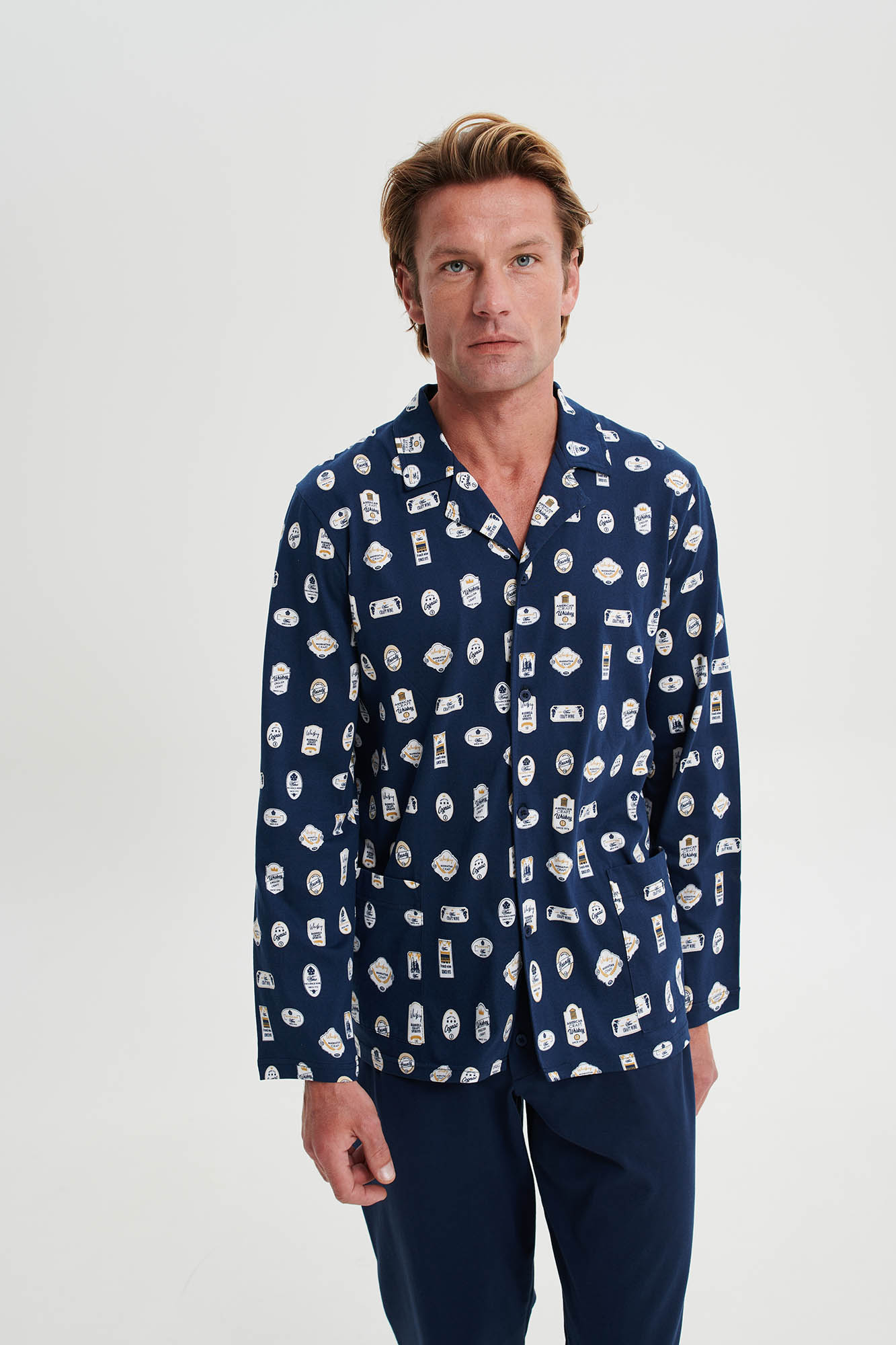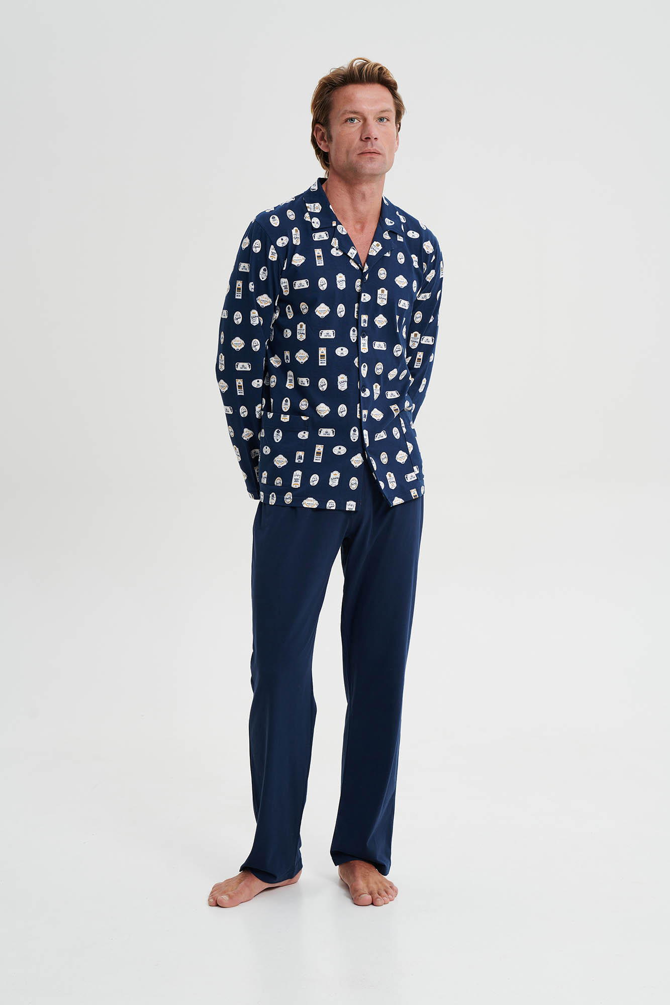 Ανδρική πυτζάμα με μονόχρωμο παντελόνι και κουμπωτό τοπ με τσέπες. Θα σας δώσει την άνεση που αποζητάτε στο σπίτι σας.