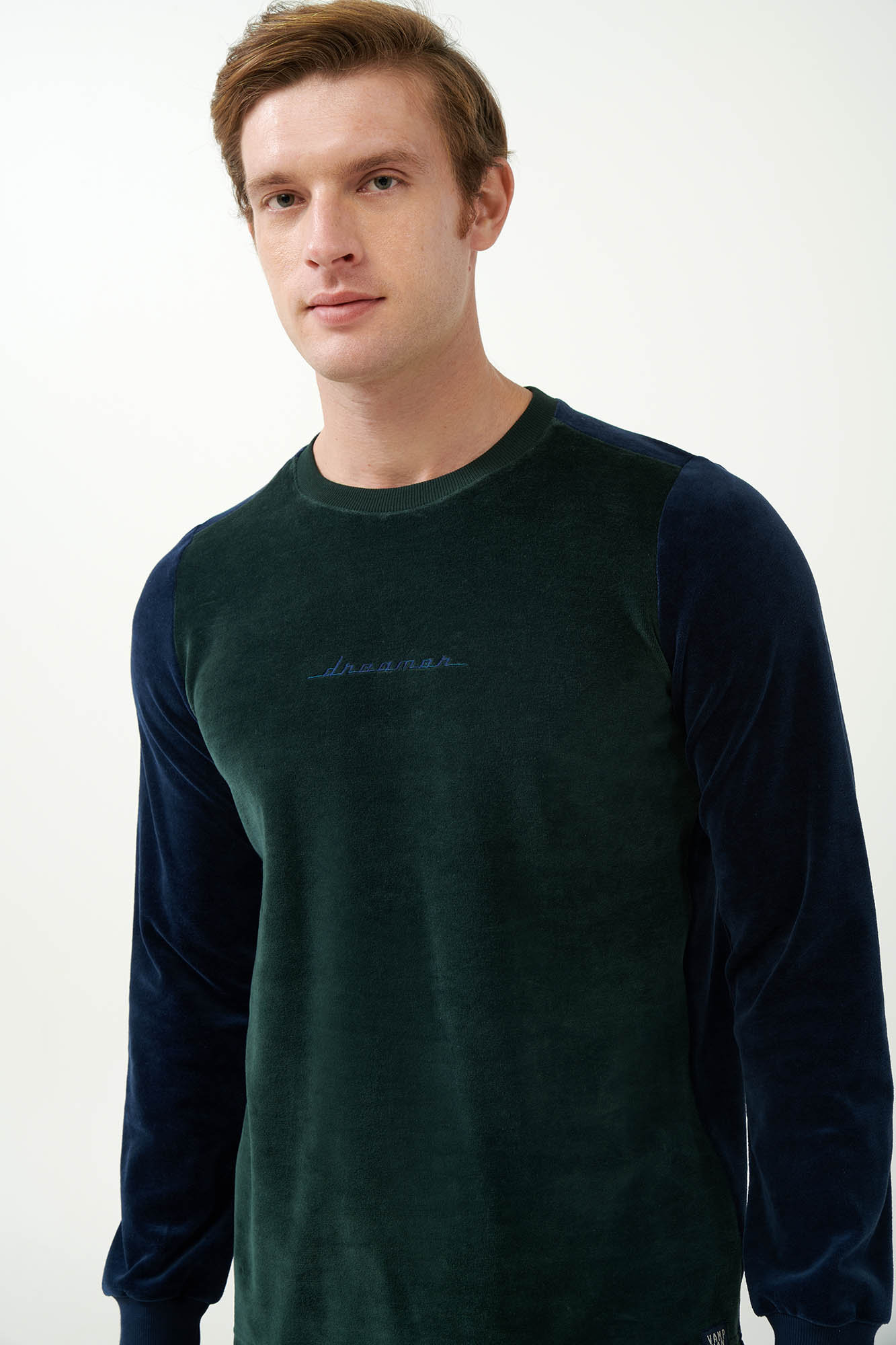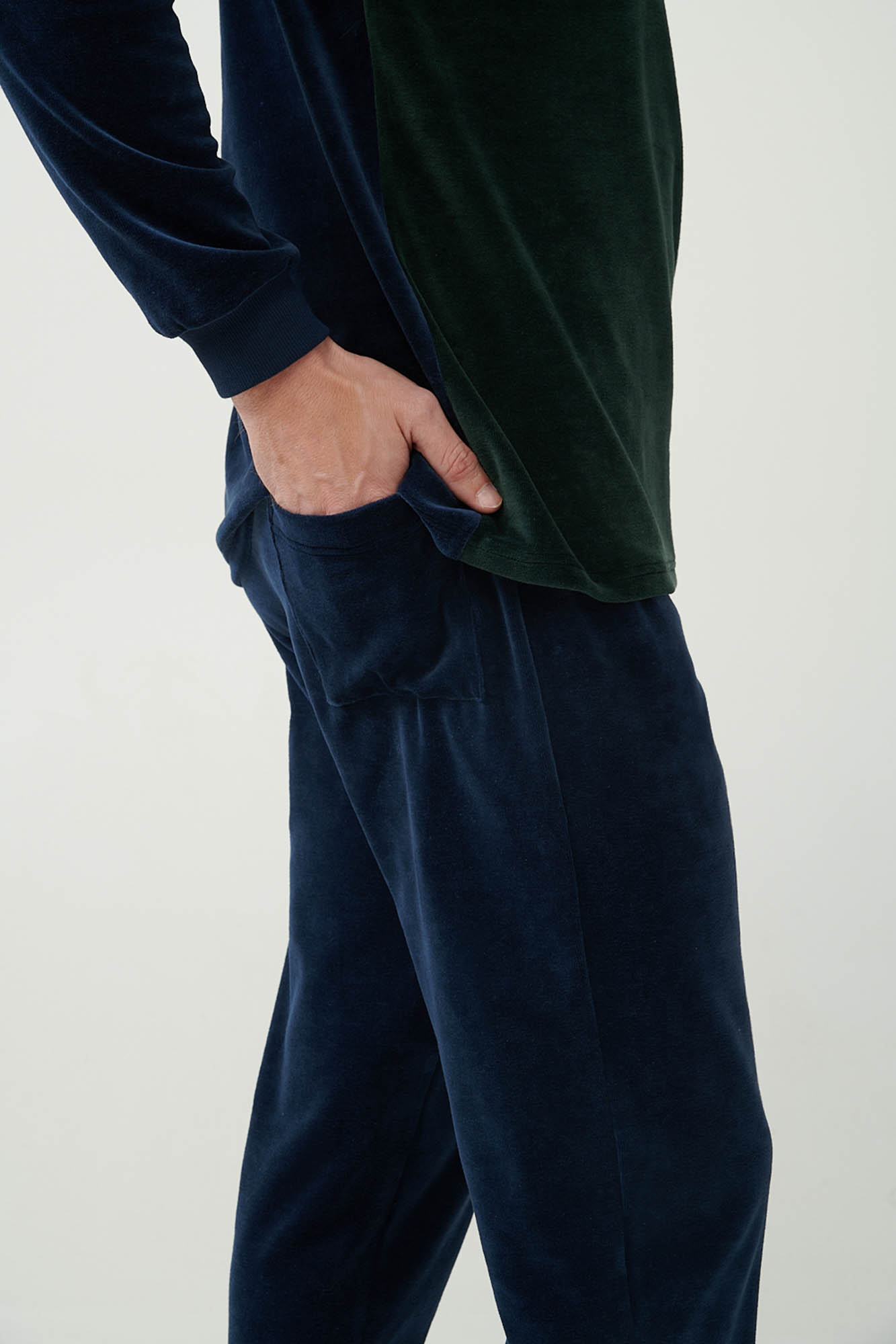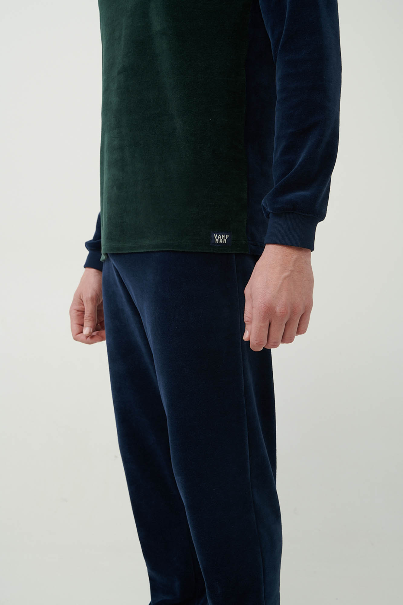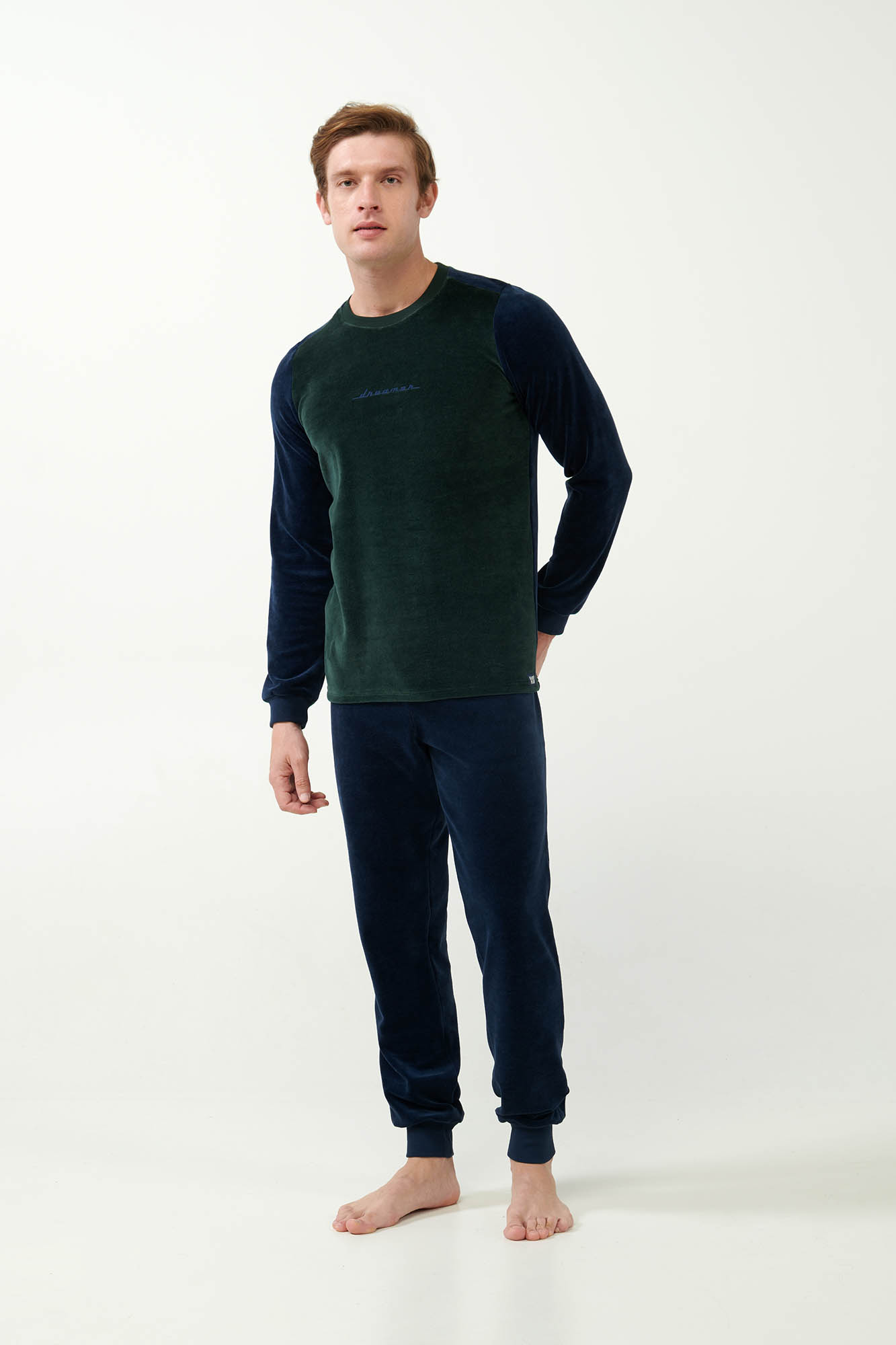 Επιλέξτε για τη χειμερινή σας συλλογή ένα σετ ανδρικές πυτζάμες που αποτελείτε από μονόχρωμο παντελόνι με μανσέτες και μπλούζα με λαιμόκοψη V και μανσέτες σε κυπαρισί – μπλε αποχρώσεις που δημιουργεί ια ευχάριστη αντίθεση χρωμάτων. Κατασκευασμένο από πλούσιο σε βαμβάκι βελούδο θα σας κρατήσει ζεστούς προσφέροντας απαλή αίσθηση στο σώμα. Ένας όμορφος που θα σας προσφέρει διαχρονική κομψότητα και άνεση και θα σας βοηθήσει να απολαύσετε τις στιγμές χαλάρωσης σας έπειτα από μια μεγάλη ημέρα.