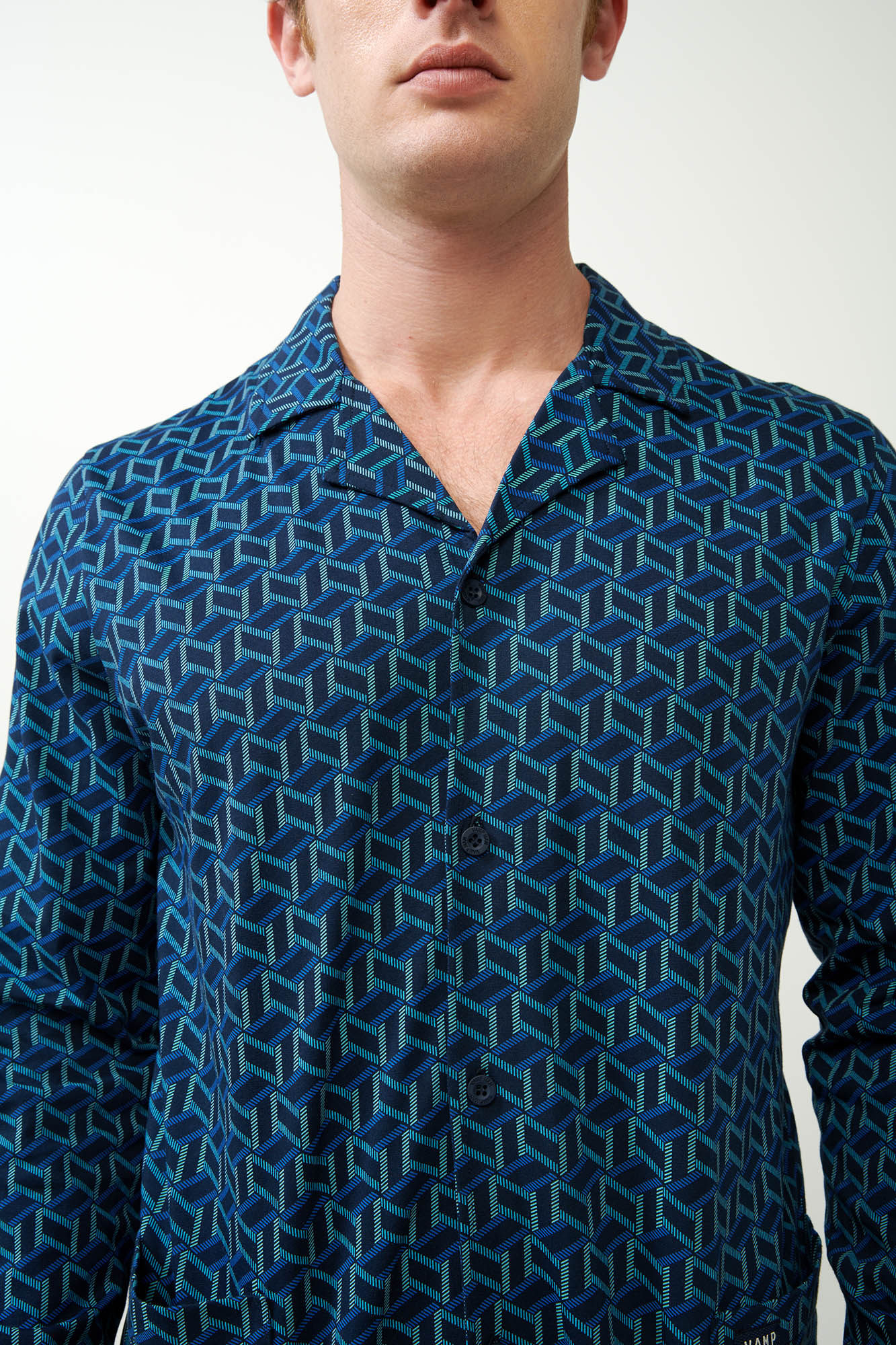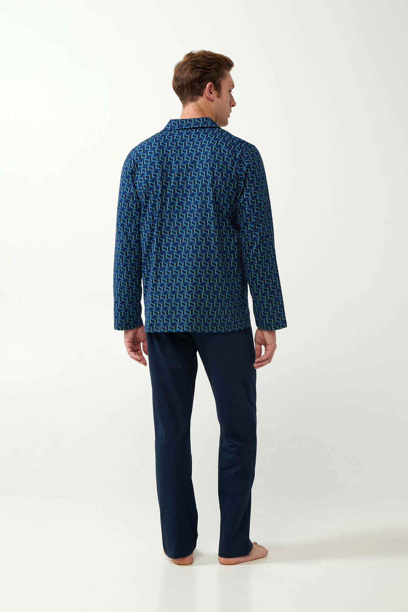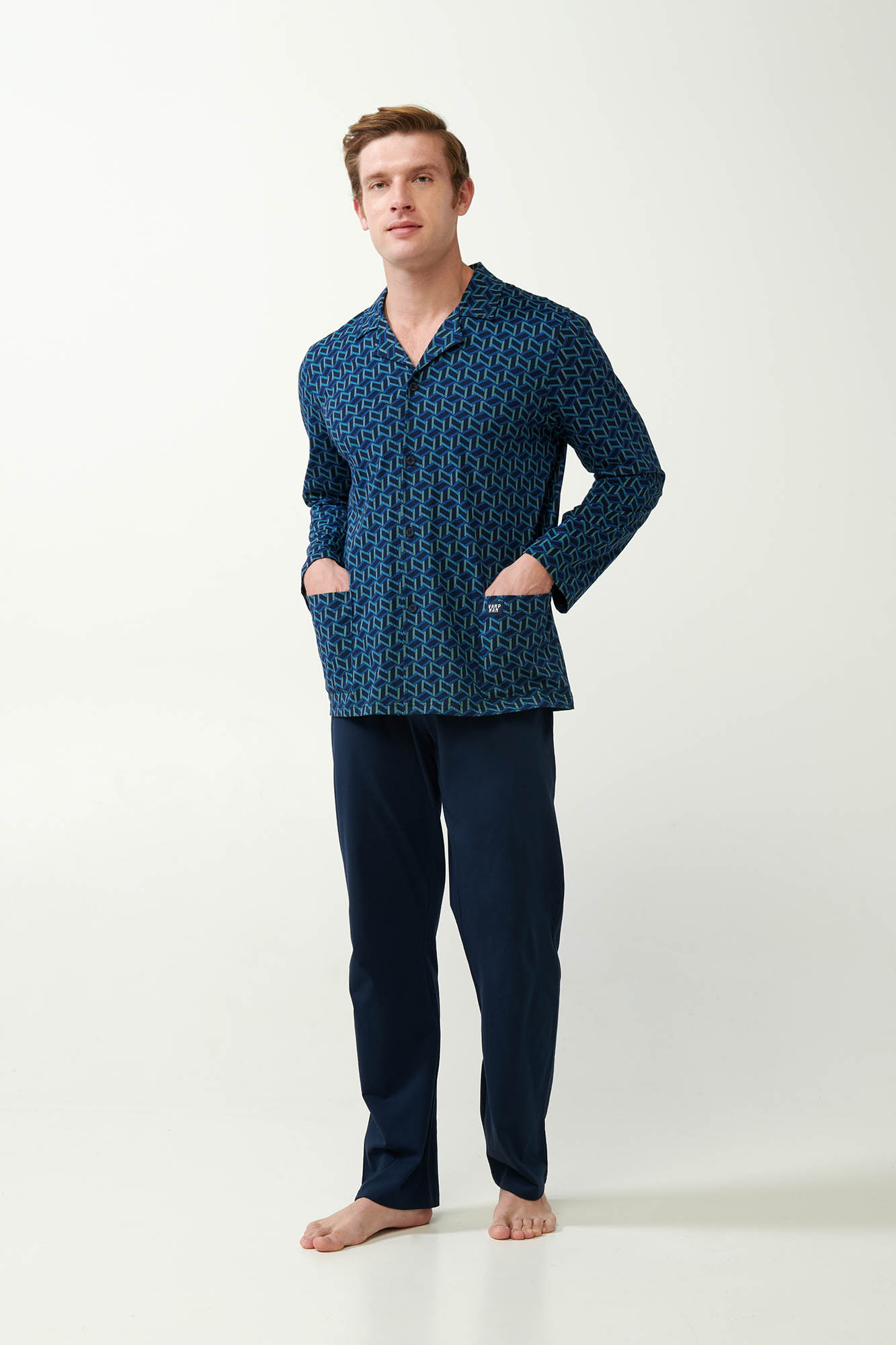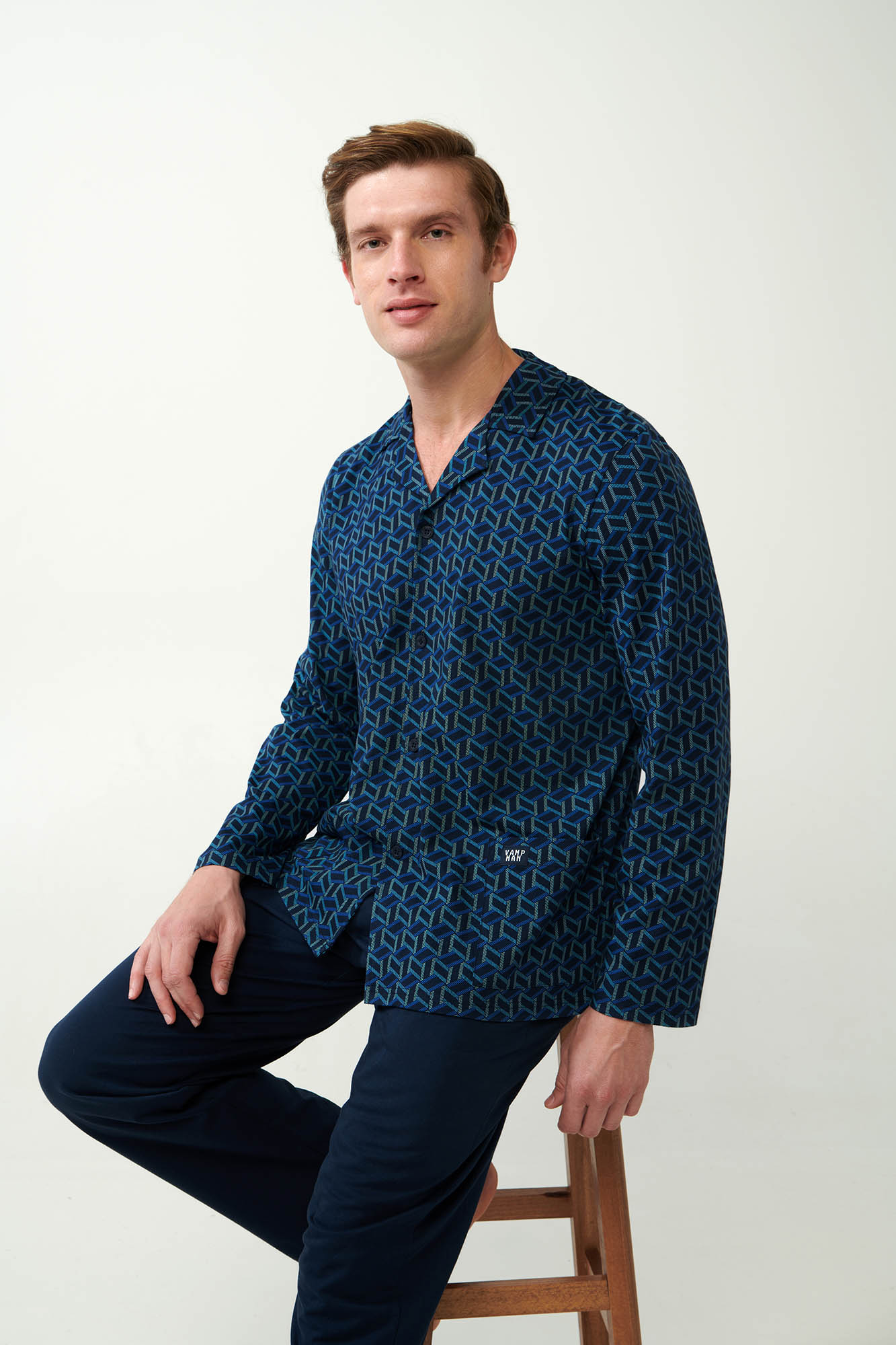 Προσθέστε στη συλλογή σας ένα σετ ανδρικές πυτζάμες που αποτελείται κλασικό κουμπωτό πάνω μέρος με τσέπες σε γεωμετρικό μοτίβο κύβων. Το σετ συμπληρώνει ένα μονόχρωμο παντελόνι με δημιουργώντας ένα αρμονικό σύνολο. Κατασκευασμένο από 100% βαμβάκι s. jersey που επιτρέπει στο σώμα να αναπνέει και χαρίζει απαλή αίσθηση στο δέρμα θα σας βοηθήσει να απολαύσετε το βραδινό σας ύπνο με διαχρονική κομψότητα.