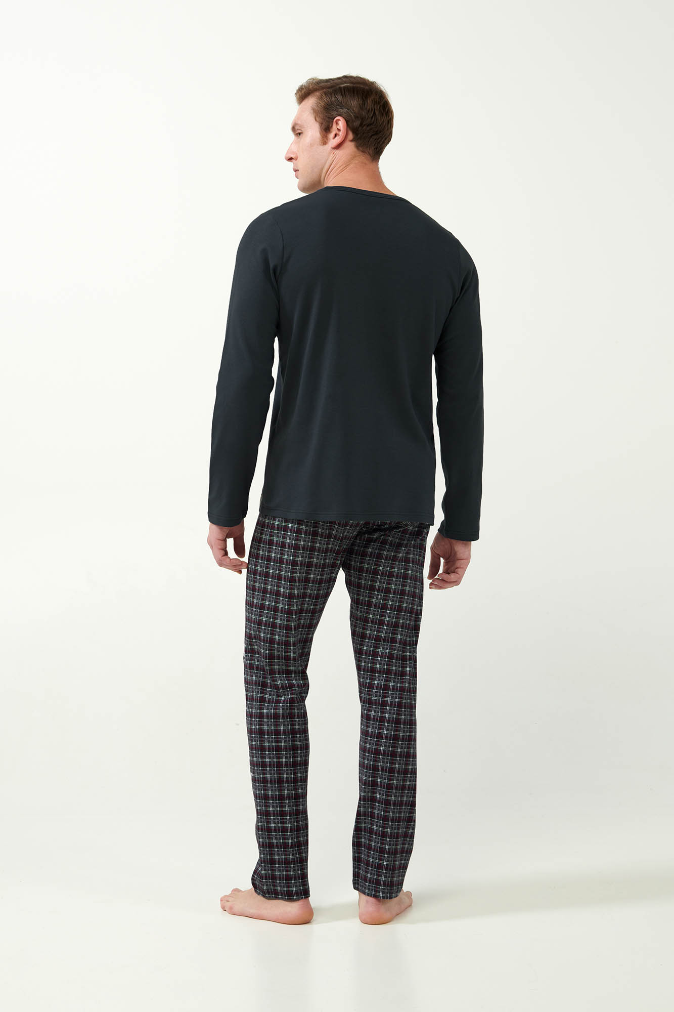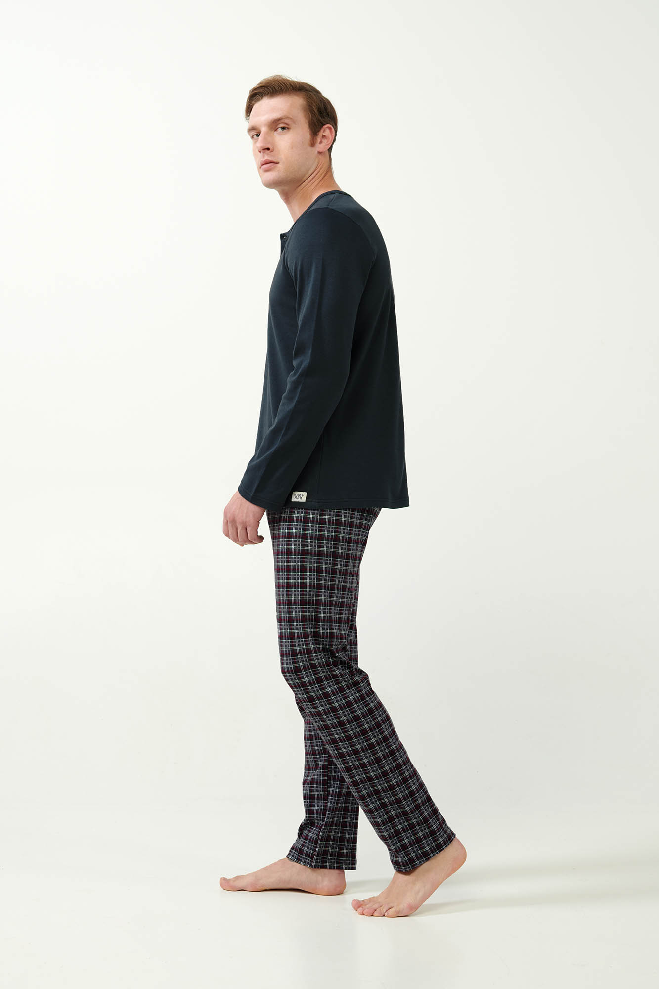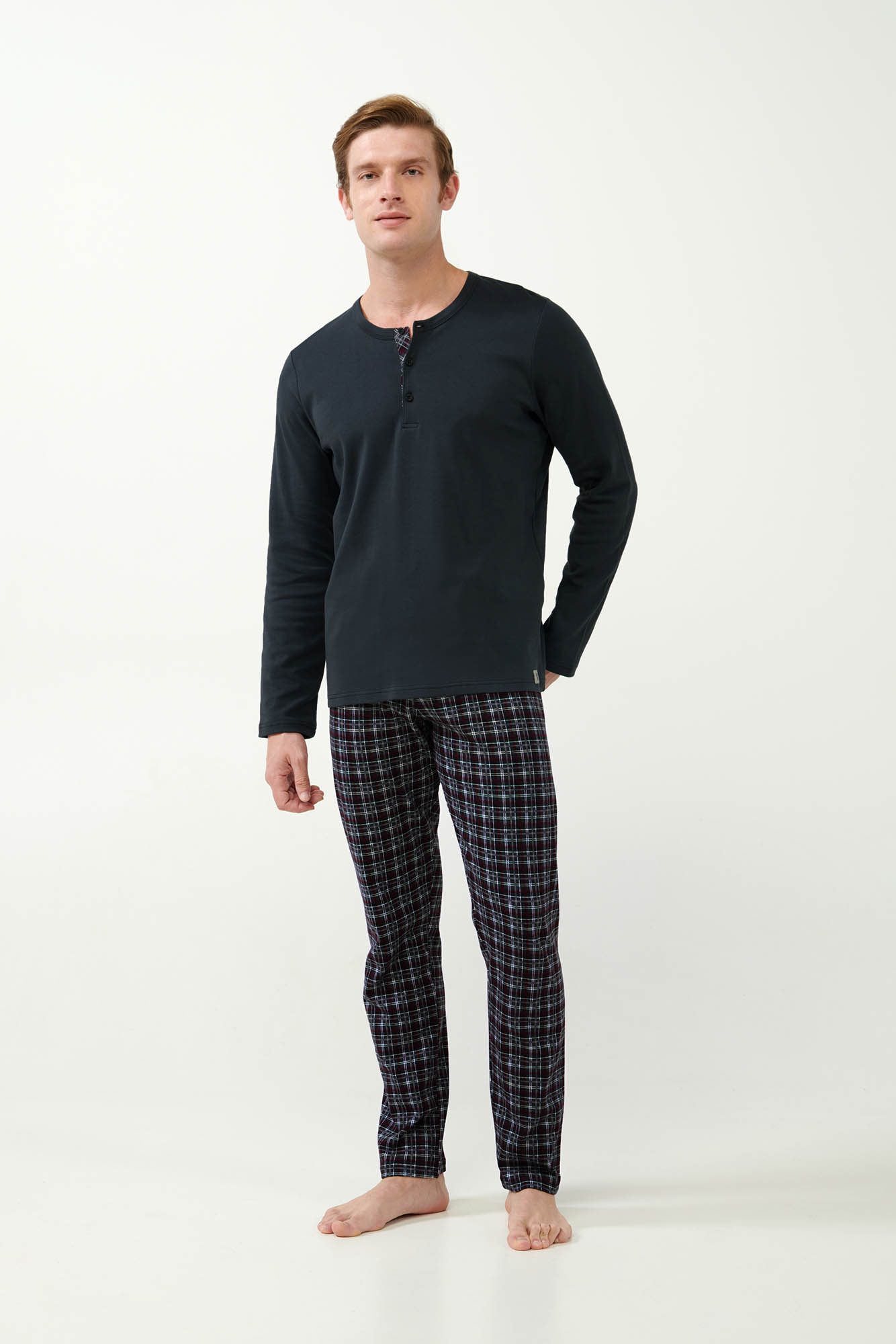 Εμπειρία διαχρονικής άνεσης με τις ανδρικές πιτζάμες με ταρτάν. Με κλασικό παντελόνι από ταρτάν και μονόχρωμη μπλούζα με κομψή κουμπότρυπα, αυτό το σετ συνδυάζει την παραδοσιακή γοητεία με τη σύγχρονη άνεση. Κατασκευασμένες από 100% βαμβάκι interlock, αυτές οι πιτζάμες προσφέρουν μια απαλή, αναπνέουσα αίσθηση που εξασφαλίζει έναν ξεκούραστο ύπνο. Ιδανικό για χαλάρωση ή ξεκούραση, αυτό το σετ είναι μια εκλεπτυσμένη επιλογή για κάθε άνδρα που αναζητά την κομψότητα και την ευκολία στα υπνόσακά του. Απογειώστε τα βράδια σας με ένα άγγιγμα κλασικού στυλ.