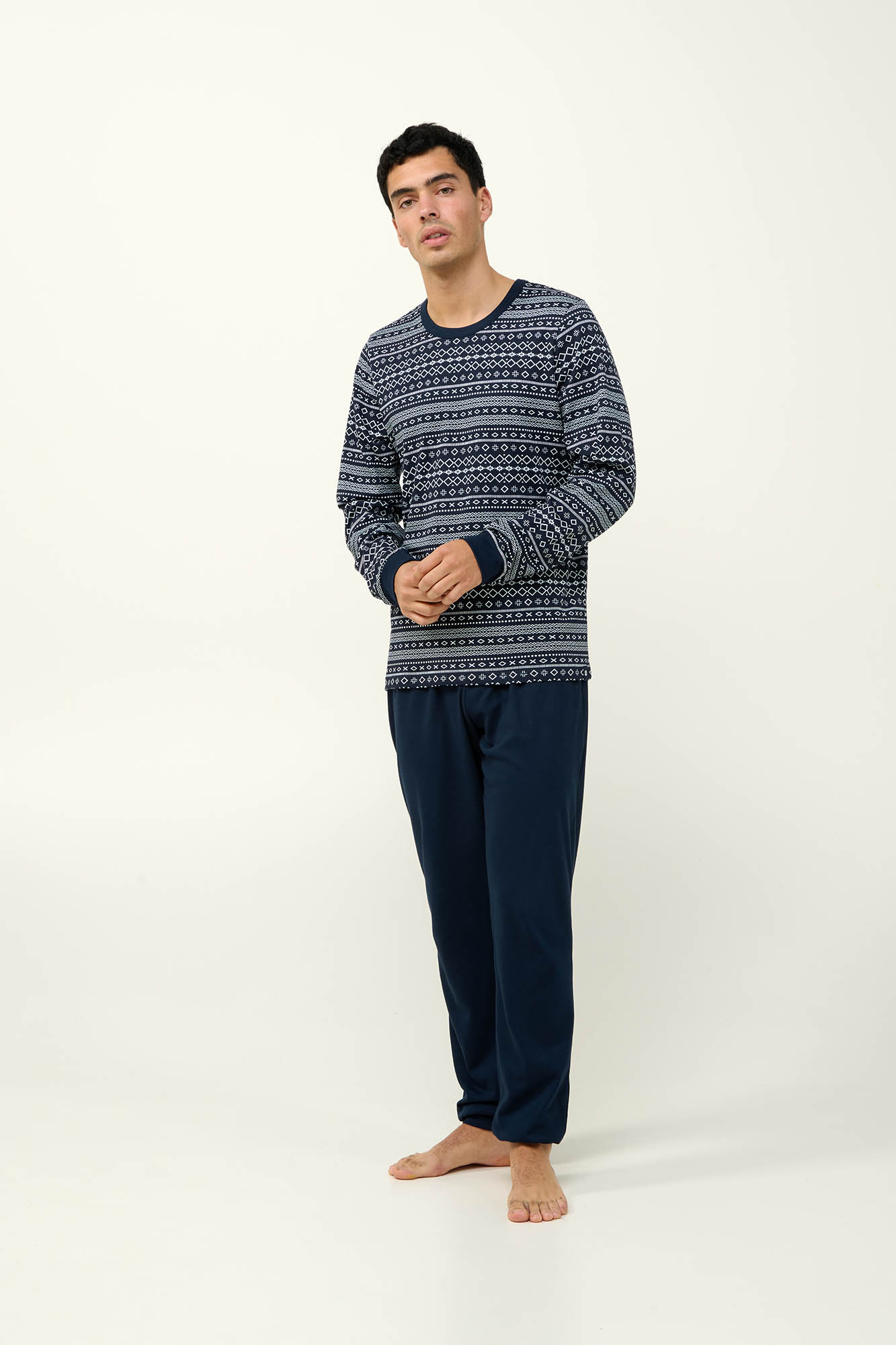 Ανακαλύψτε την απόλυτη άνεση με αυτό το χειμερινό σετ ανδρικές πυτζάμες, φτιαγμένο από 100% βαμβάκι interlock που προσφέρει απαλή και διαπνέουσα αίσθηση. Το πάνω μέρος με μανσέτες διαθέτει κομψό γεωμετρικό σχέδιο που θυμίζει σκανδιναβικό μοτίβο, προσθέτοντας μια διακριτική χειμερινή γοητεία. Συνδυάζεται με απλό παντελόνι επίσης με μανσέτες, ιδανικό για χαλάρωση ή ύπνο τους κρύους μήνες