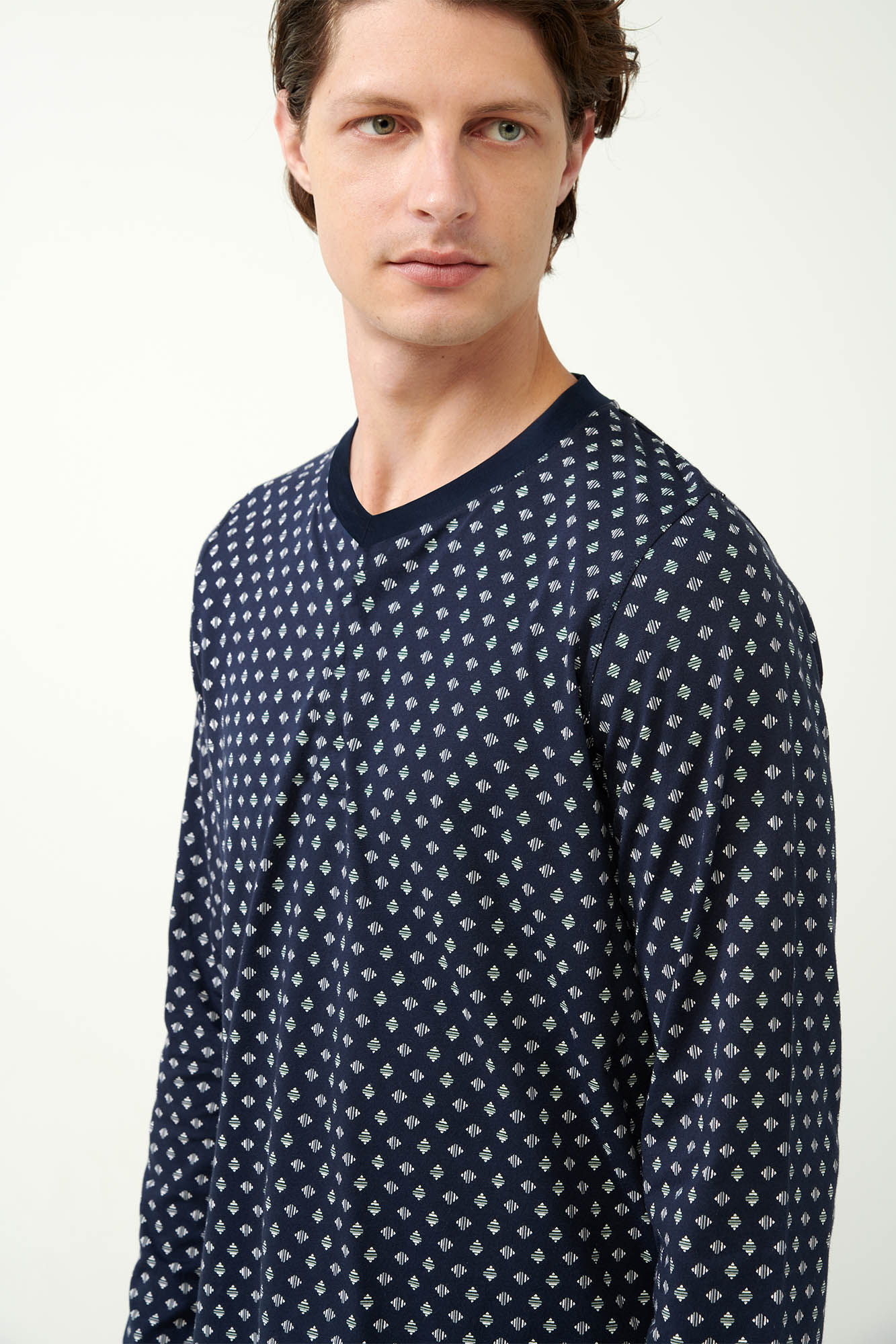 Παραμείνετε άνετος με ένα σετ χειμερινές ανδρικές πυτζάμες που αποτελείτε από μονόχρωμο παντελόνι και εμπριμέ μπλούζα με μακρύ μανίκι και κλασική λαιμόκοψη V. Το σετ είναι κατασκευασμένο από 100% βαμβάκι s. jersey που επιτρέπει στο δέρμα να αναπνέει και χαρίζει απαλή αίσθηση στο σώμα. Μια ιδανική επιλογή για να χαλαρώσετε με στυλ και να απολαύσετε τον βραδινό σας ύπνο.