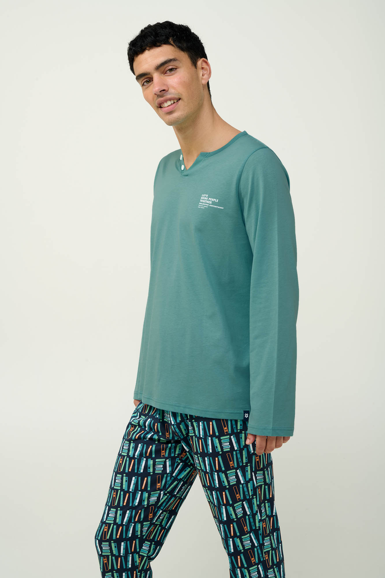 Επιλέξτε ένα σετ ανδρικές χειμερινές πυτζάμες από απαλό και διαπνέον 100% βαμβάκι s. jersey. Το πάνω μέρος έχει μακριά μανίκια και διακριτική V λαιμόκοψη ενώ το παντελόνι ξεχωρίζει χάρη στο ιδιαίτερο μοτίβο που απεικονίζει μια γεμάτη βιβλιοθήκη. Ένα ιδανικό σετ για να χαλαρώσετε διαβάζοντας το αγαπημένος σας βιβλίο ή να απολαύσετε τον βραδινό σας ύπνο.