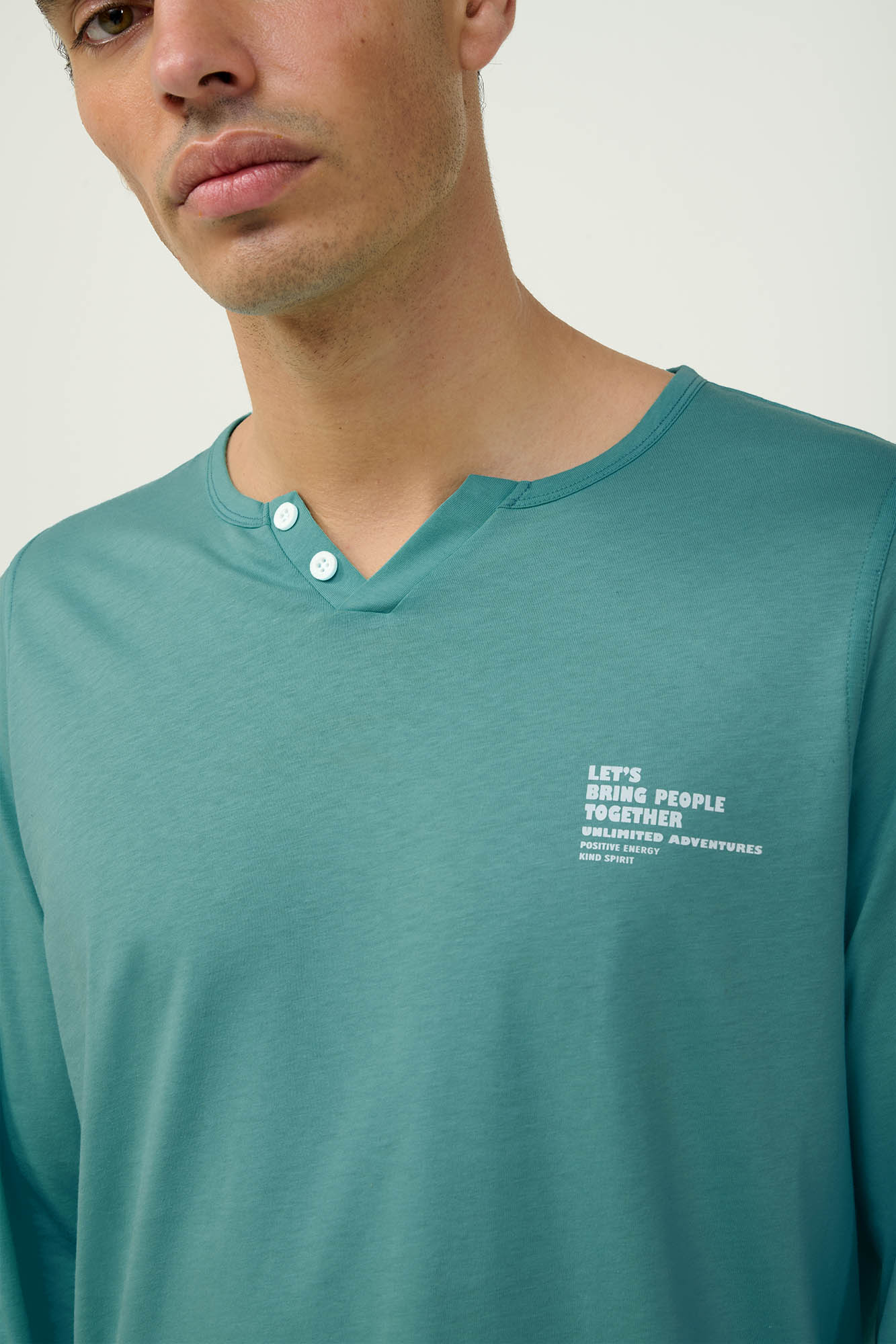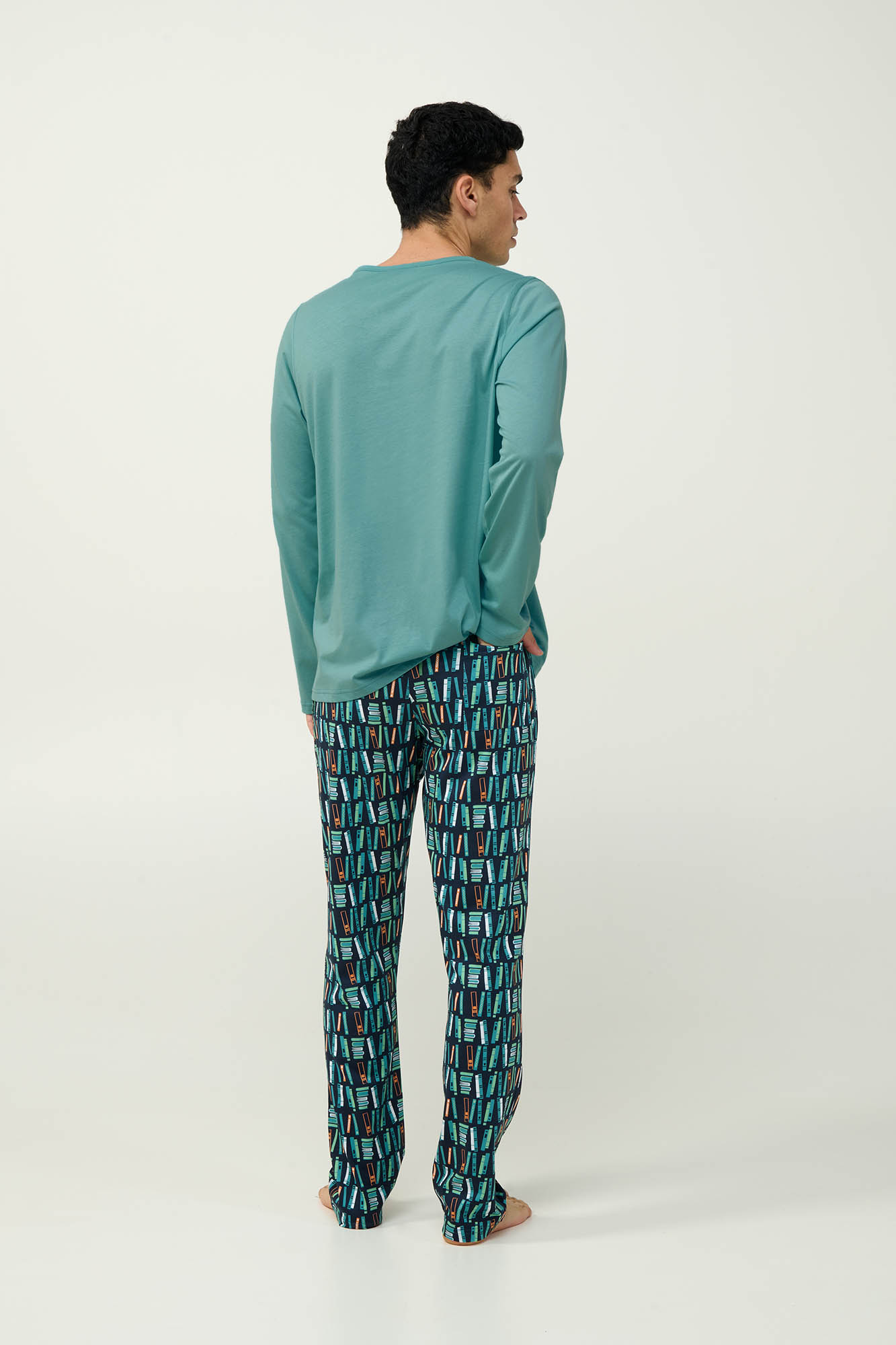 Επιλέξτε ένα σετ ανδρικές χειμερινές πυτζάμες από απαλό και διαπνέον 100% βαμβάκι s. jersey. Το πάνω μέρος έχει μακριά μανίκια και διακριτική V λαιμόκοψη ενώ το παντελόνι ξεχωρίζει χάρη στο ιδιαίτερο μοτίβο που απεικονίζει μια γεμάτη βιβλιοθήκη. Ένα ιδανικό σετ για να χαλαρώσετε διαβάζοντας το αγαπημένος σας βιβλίο ή να απολαύσετε τον βραδινό σας ύπνο.