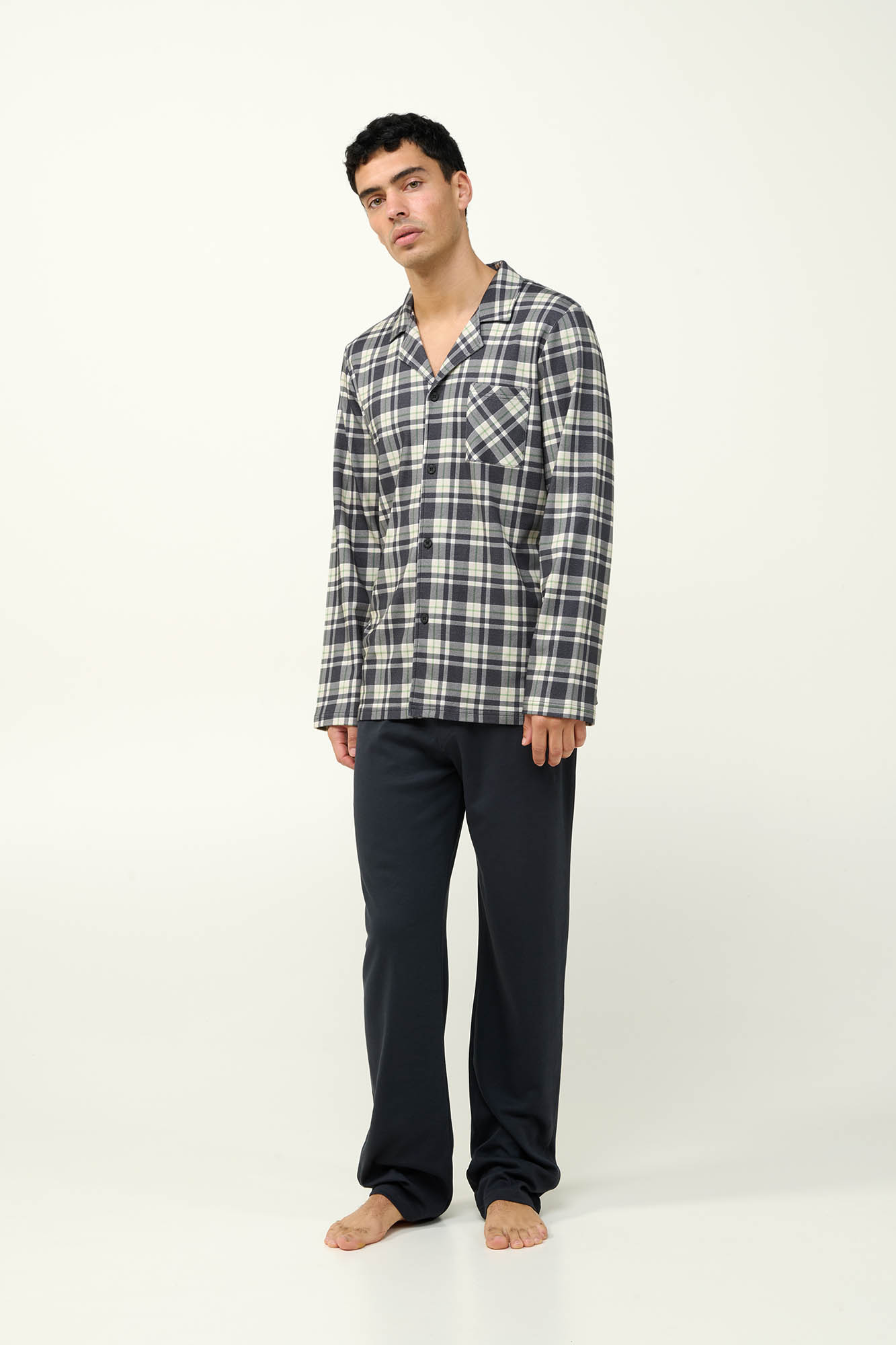 Επιλέξτε ένα σετ ανδρικές πυτζάμες από 100% βαμβάκι interlock, που προσφέρει απαλότητα και διαπνοή για απόλυτη άνεση. Το κουμπωτό πάνω μέρος με μακριά μανίκια και διαχρονικό καρό μοτίβο χαρίζει κομψότητα στις στιγμές χαλάρωσης σας, ενώ το μονόχρωμο παντελόνι δημιουργεί μια όμορφη αντίθεση. Η κανονική εφαρμογή εξασφαλίζει ελευθερία κινήσεων, είτε ξεκουράζεστε στον καναπέ είτε ετοιμάζεστε για ύπνο. Ένα διαχρονικό κομμάτι για άνετο και απλό χειμερινό στιλ.