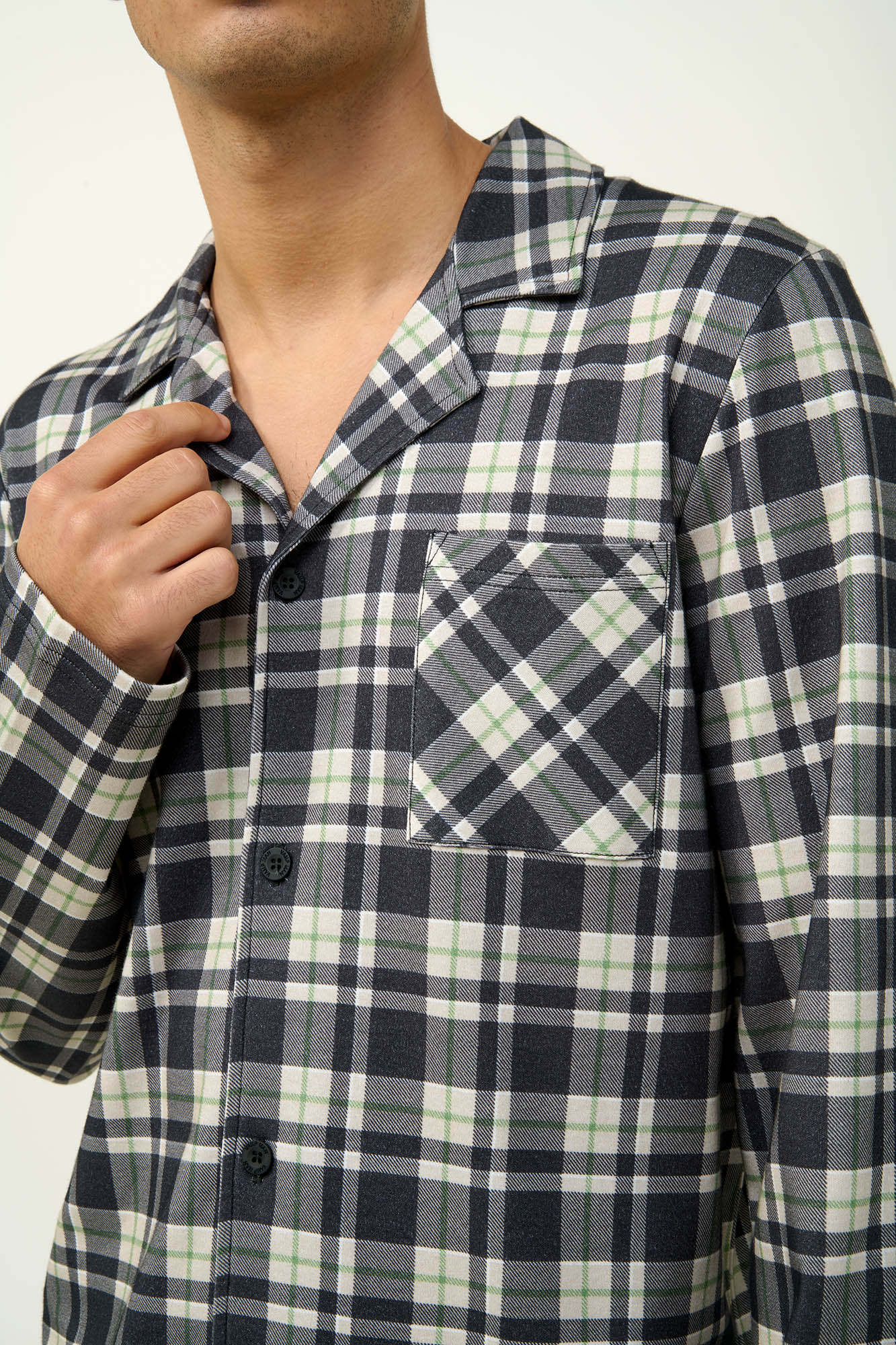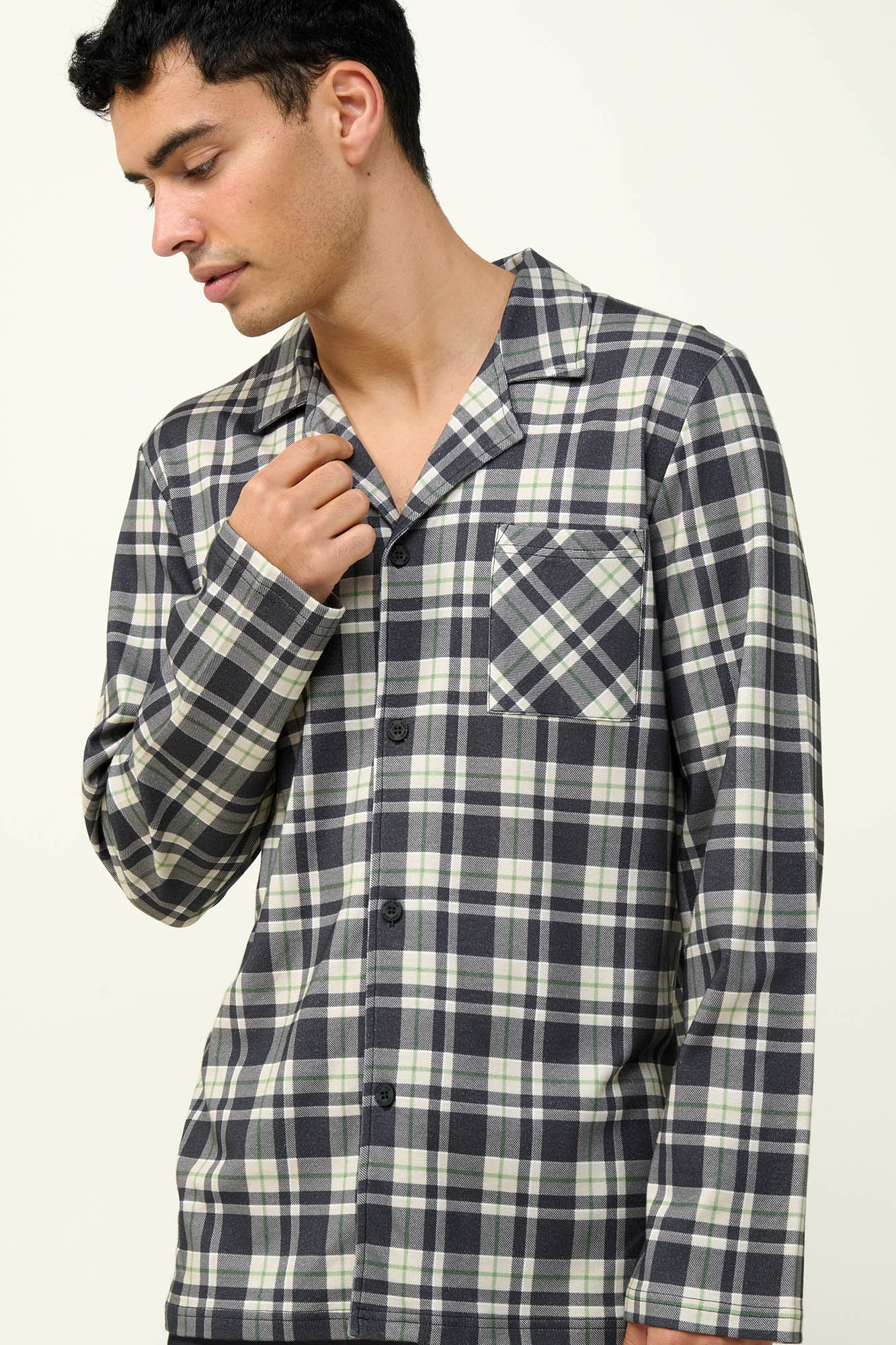 Επιλέξτε ένα σετ ανδρικές πυτζάμες από 100% βαμβάκι interlock, που προσφέρει απαλότητα και διαπνοή για απόλυτη άνεση. Το κουμπωτό πάνω μέρος με μακριά μανίκια και διαχρονικό καρό μοτίβο χαρίζει κομψότητα στις στιγμές χαλάρωσης σας, ενώ το μονόχρωμο παντελόνι δημιουργεί μια όμορφη αντίθεση. Η κανονική εφαρμογή εξασφαλίζει ελευθερία κινήσεων, είτε ξεκουράζεστε στον καναπέ είτε ετοιμάζεστε για ύπνο. Ένα διαχρονικό κομμάτι για άνετο και απλό χειμερινό στιλ.
