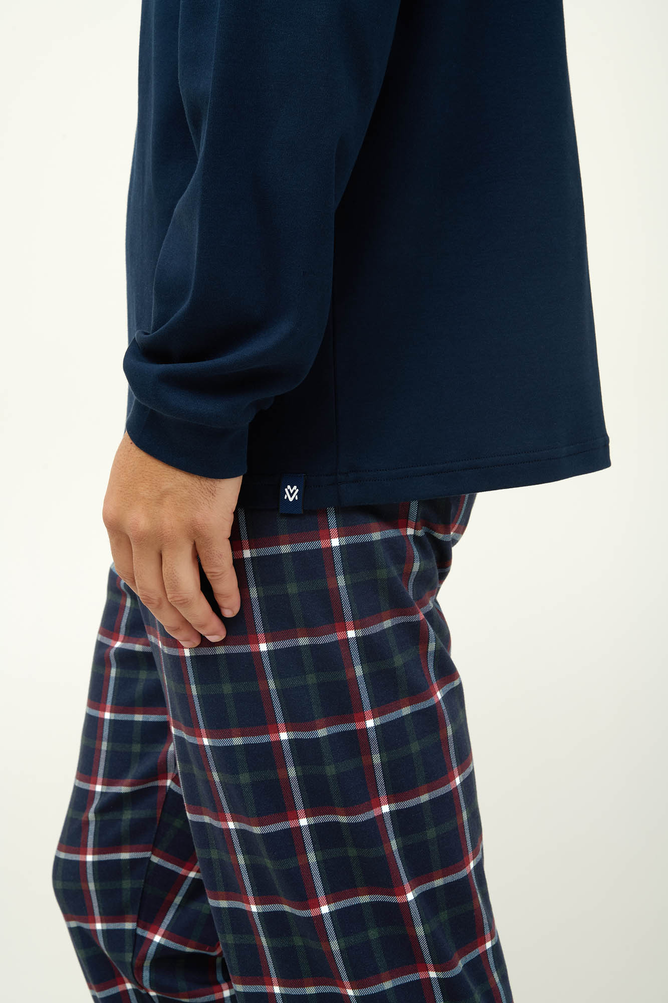 Προσθέστε μια ζεστή και χαριτωμένη νότα στα βράδια του χειμώνα με αυτές τις ανδρικές πυτζάμες, φτιαγμένες από 100% βαμβάκι interlock για μοναδική απαλότητα και άνεση. Αποτελείτε από μπλούζα με μανσέτες στα μανίκια και ένα αξιαγάπητο αρκουδάκι με καρό κασκόλ στο στήθος. Το σετ συμπληρώνει ένα παντελόνι με μανσέτες σε κλασικό καρό μοτίβο. Ιδανικό για στιγμές χαλάρωσης ή έναν ευχάριστο βραδινό ύπνο.