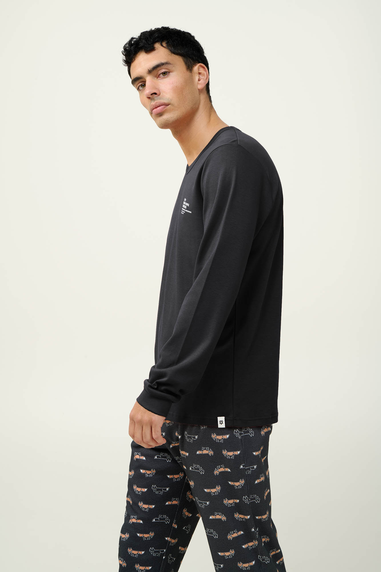 Χαλαρώστε με άνεση και στυλ με αυτές τις ανδρικές χειμερινές πυτζάμες από 100% βαμβάκι interlock, που χαρίζει απαλή αίσθηση και επιστρέπει στο δέρμα να αναπνέει. Το μονόχρωμο τοπ με V λαιμόκοψη και μακριά μανίκια έχει μανσέτες για βέλτιστη εφαρμογή και διαχρονική εμφάνιση. Το σετ ολοκληρώνεται με παντελόνι που έχει επίσης μανσέτες και παιχνιδιάρικο μοτίβο με αλεπούδες σε στυλ καρτούν. Ιδανικές για χαλαρές στιγμές στο σπίτι, αυτές οι πυτζάμες συνδυάζουν άνεση και ξεχωριστό χαρακτήρα.