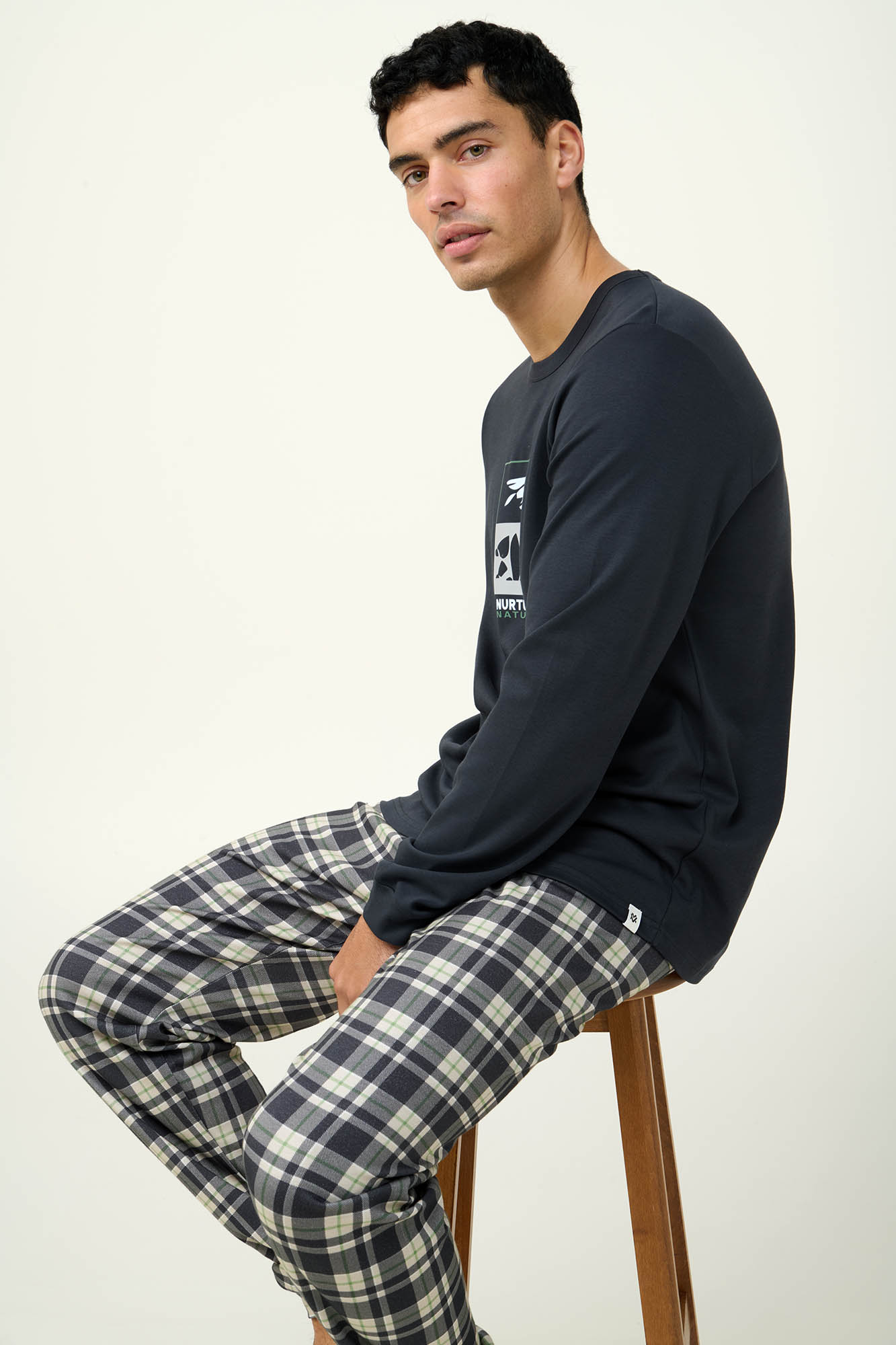 Ανανεώστε τη χειμερινή σας γκαρνταρόμπα με αυτές τις ανδρικές πυτζάμες από 100% ααλό και διαπνέον βαμβάκι interlock. Αποτελείται από μπλούζα με μανσέτες στα μανίκια και τυπωμα στο στήθος εμπνευσμένο από τη φύση. Το σετ συμπληρώνει ένα μακρύ, καρό παντελόνι με μανσέτες. Μια ιδανική επιλογή για άνετες στιγμές στο σπίτι.