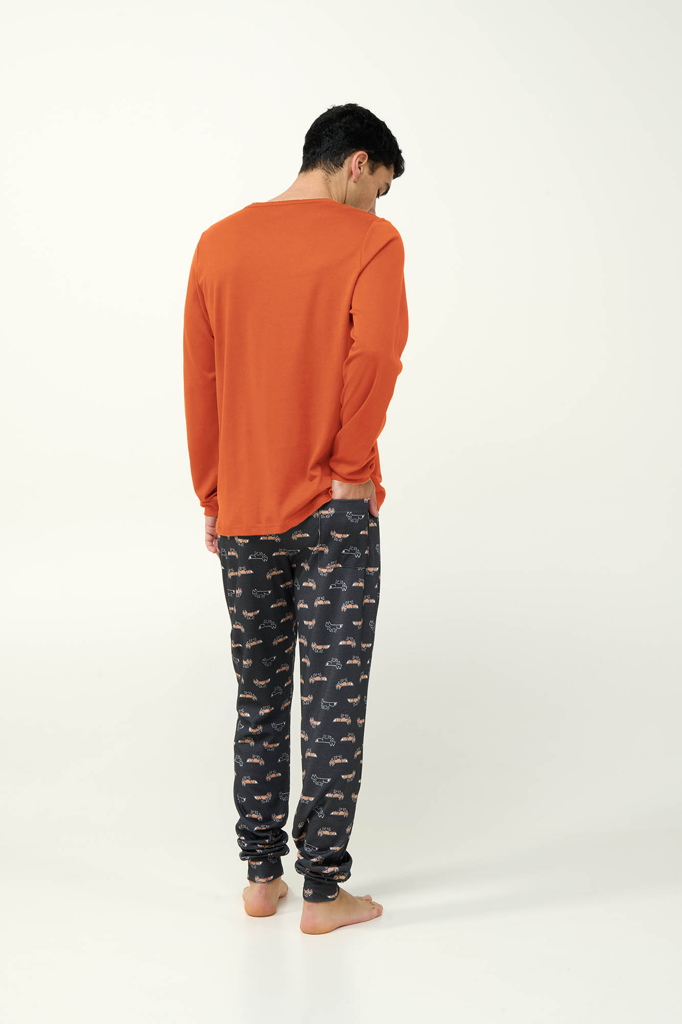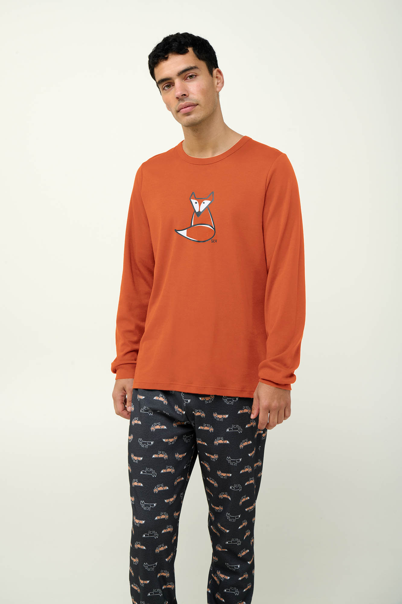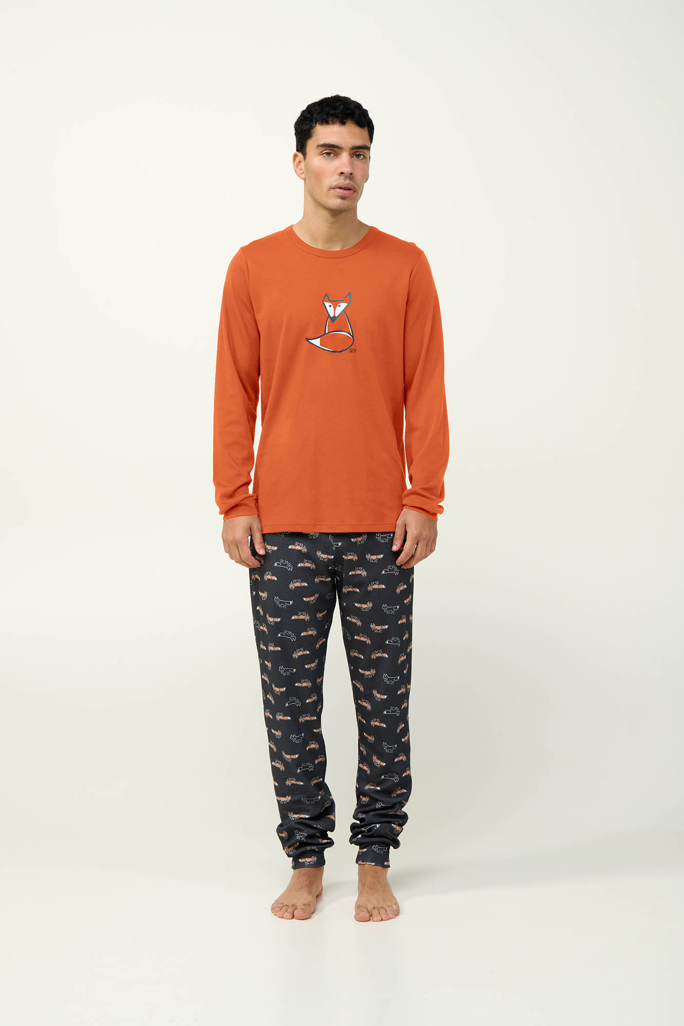 Απολαύστε κάθε στιγμή με αυτές τις ανδρικές χειμερινές πυτζάμες, φτιαγμένες από100% βαμβάκι interlock για απαλή αίσθηση και φυσική διαπνοή. Το πάνω μέρος έχει μανσέτες και μια χαριτωμένη αλεπού στο στήθος, προσθέτοντας μια ευχάριστη νότα στο σύνολο σας. Το σετ συμπληρώνει ιδανικά ένα παντελόνι με μανσέτες και all-over μοτίβο με αλεπούδες, προσφέροντας άνεση και στιλ. Με χαλαρή εφαρμογή και απαλή υφή, είναι η ιδανική επιλογή για στιγμές χαλάρωσης ή έναν ξεκούραστο ύπνο.