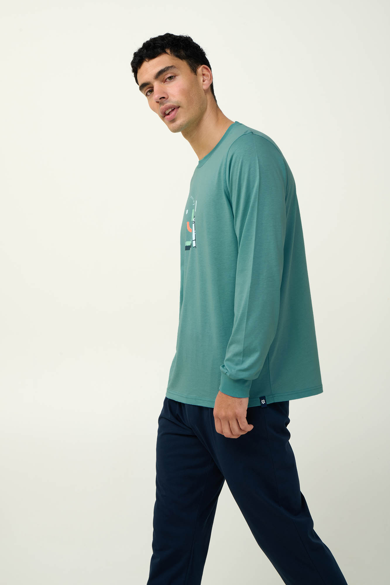 Επιλέξτε ένα σετ χειμερινές ανδικρές πυτζάμες από 100% βαμβακερό ύφασμα S. Jersey. Το επάνω μέρος έχει μακριά μανίκια με μανσέτες και ένα όμορφο τύπωμα στο στήθος με θέμα τα βιβλία. Το σετ συμπληρώνει αρμονικά ένα μονόχρωμο παντελόνι. Ανάλαφρο, διαπνέον και σχεδιασμένο για άνεση, αυτό το σετ είναι ιδανικό για ήρεμες βραδιές στο σπίτι ή έναν χαλαρό ύπνο.