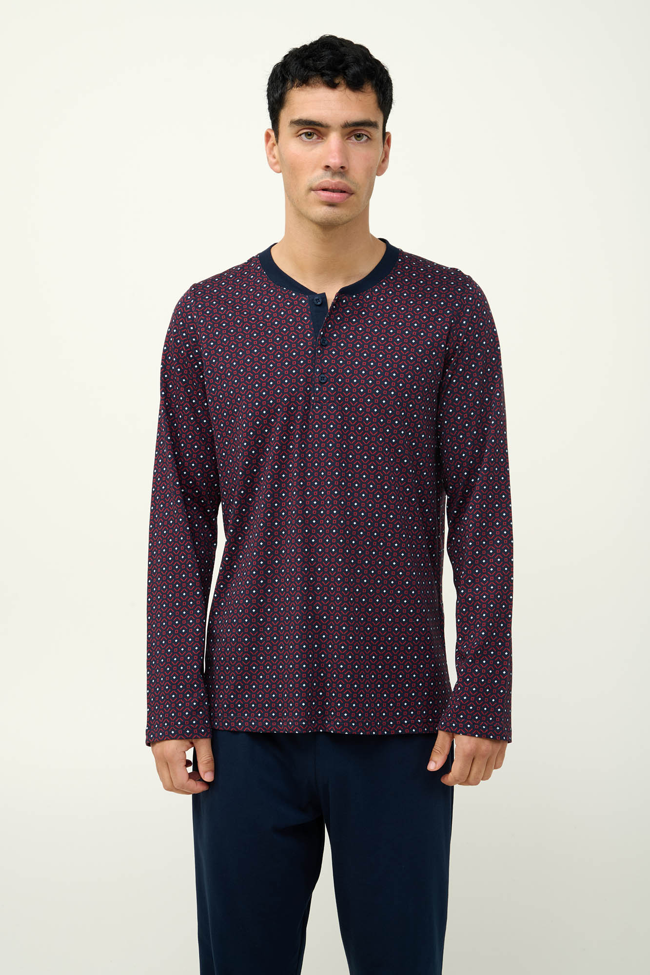 Απόλαυσε τον ιδανικό συνδυασμό άνεσης και στυλ με αυτή την ανδρική χειμερινή πυτζάμα. Κατασκευασμένη από 100% βαμβάκι s. jersey, προσφέρει απαλή και διαπνέουσα αίσθηση στο δέρμα. Το πάνω μέρος διαθέτει πατιλέτα και είναι διακοσμημένο με ένα επαναλαμβανόμενο γεωμετρικό μοτίβο, που χαρίζει διαχρονική αλλά μοντέρνα γοητεία, ενώ το κάτω μέρος είναι μονόχρωμο για να χαρίζει ισορροπία στο σύνολο. Ιδανική για τις στιγμές χαλάρωσης σας και έναν άνετο βραδινό ύπνο.