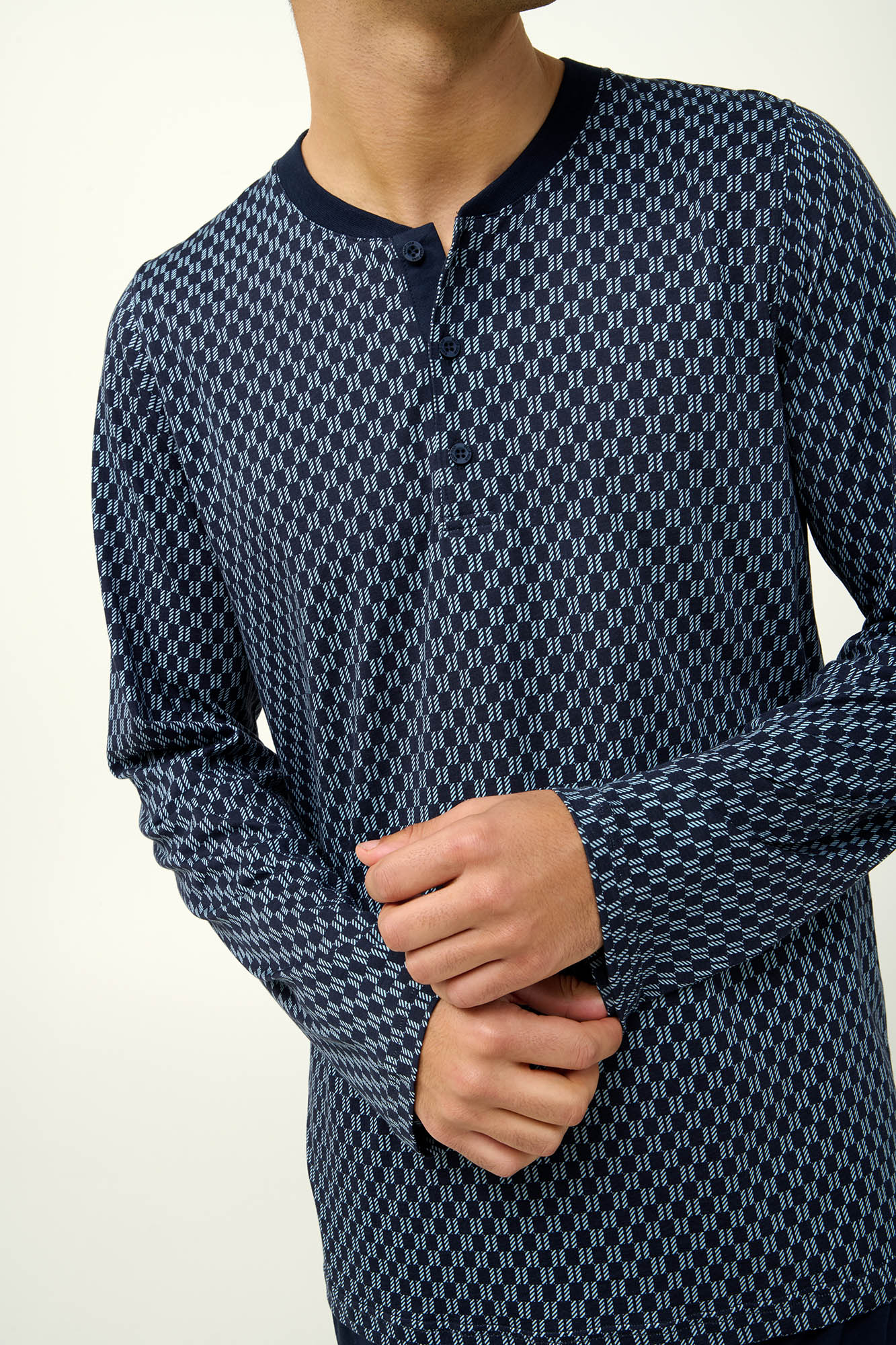 Αυτές οι ανδρικές χειμερινές πυτζάμες συνδυάζουν κλασικό στιλ με καθημερινή άνεση. Φτιαγμένες από 100% απαλό και διαπνέον βαμβάκι s. jersey, με πατιλέτα και διακριτικό γεωμετρικό μοτίβο στη μπλούζα. Ένα μονόχρωμο παντελόνι ολοκληρώνει το σύνολο με ενισχύοντας τον διαχρονικό του χαρακτήρα. Ένα κλασικό σετ που θα απολαύστε για χρόνια στις στιγμές χαλάρωσης σας.