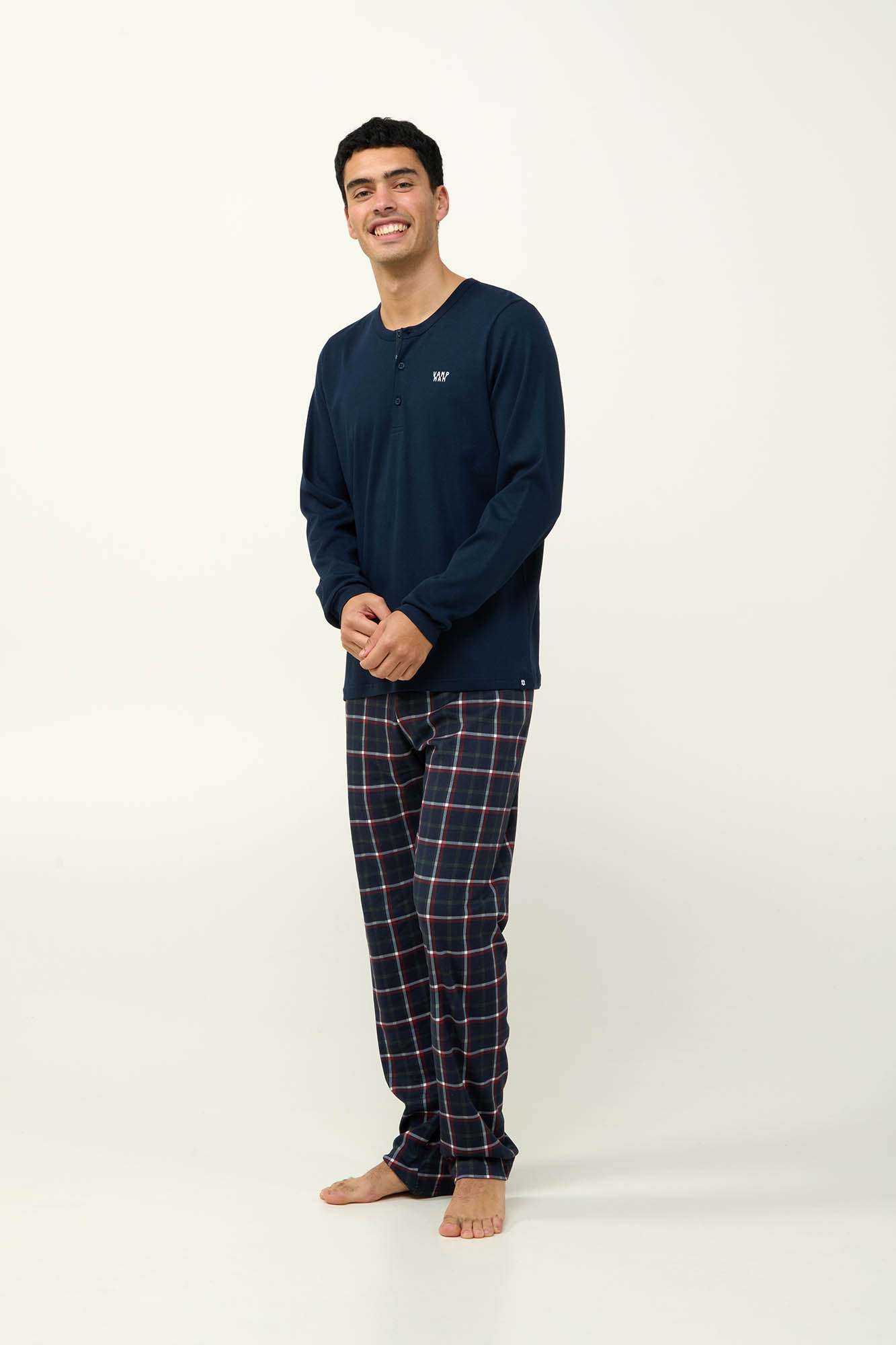 Επιλέξτε ένα σετ ανδρικές χειμερινές πυτζάμες, κατασκευασμένες από 100% βαμβάκι interlock με απαλή υφή και φυσική διαπνοή. Το μονόχρωμο μακρυμάνικο τοπ με μανσέτες και πρακτική πατιλέτα προσφέρει έχει άνετη εφαρμογή και συνδυάζεται ιδανικά με παντελόνι σε διαχρονικό καρό μοτίβο. Ένα σετ που συνδυάζει κλασική γοητεία και καθημερινή άνεση.