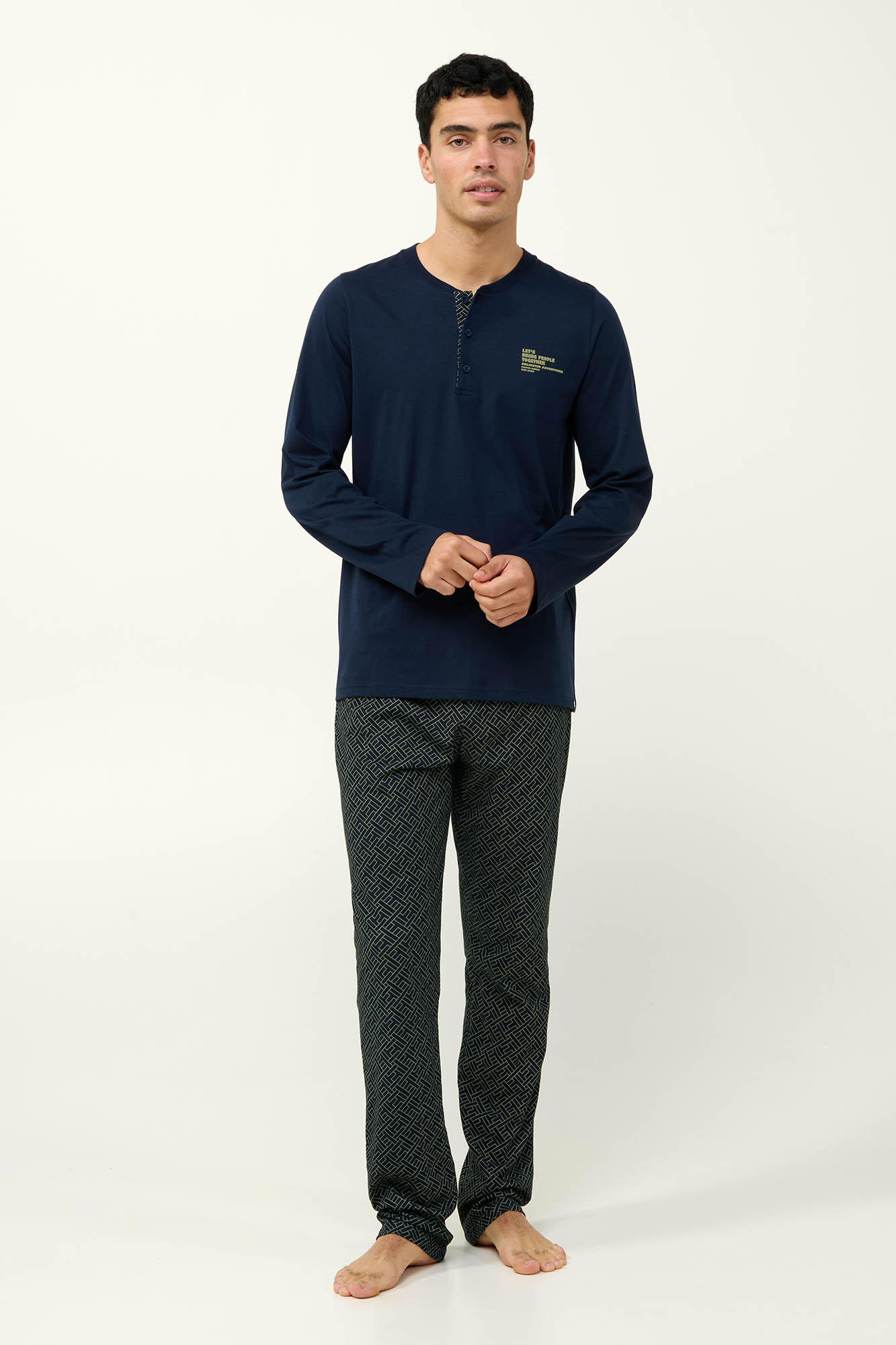 Επιλέξτε ένα σετ χειμερινές ανδρικές πυτζάμες από 100% βαμβάκι s. jersey. Το επάνω μέρος έχει πατιλέτα που προσφέρει άνετη εφαρμογή και κλασικό, καθαρό στυλ, ενώ το παντελόνι με γεωμετρικό μοτίβο χαρίζει μοντέρνο χαρακτήρα. Το απαλό και διαπνέον ύφασμα εξασφαλίζει άνεση όλη τη νύχτα, καθιστώντας αυτό το σετ ιδανικό τόσο για τον ύπνο όσο και για στιγμές χαλάρωσης στο σπίτι. Ένα διαχρονικό κομμάτι για τη χειμερινή σας γκαρνταρόμπα.